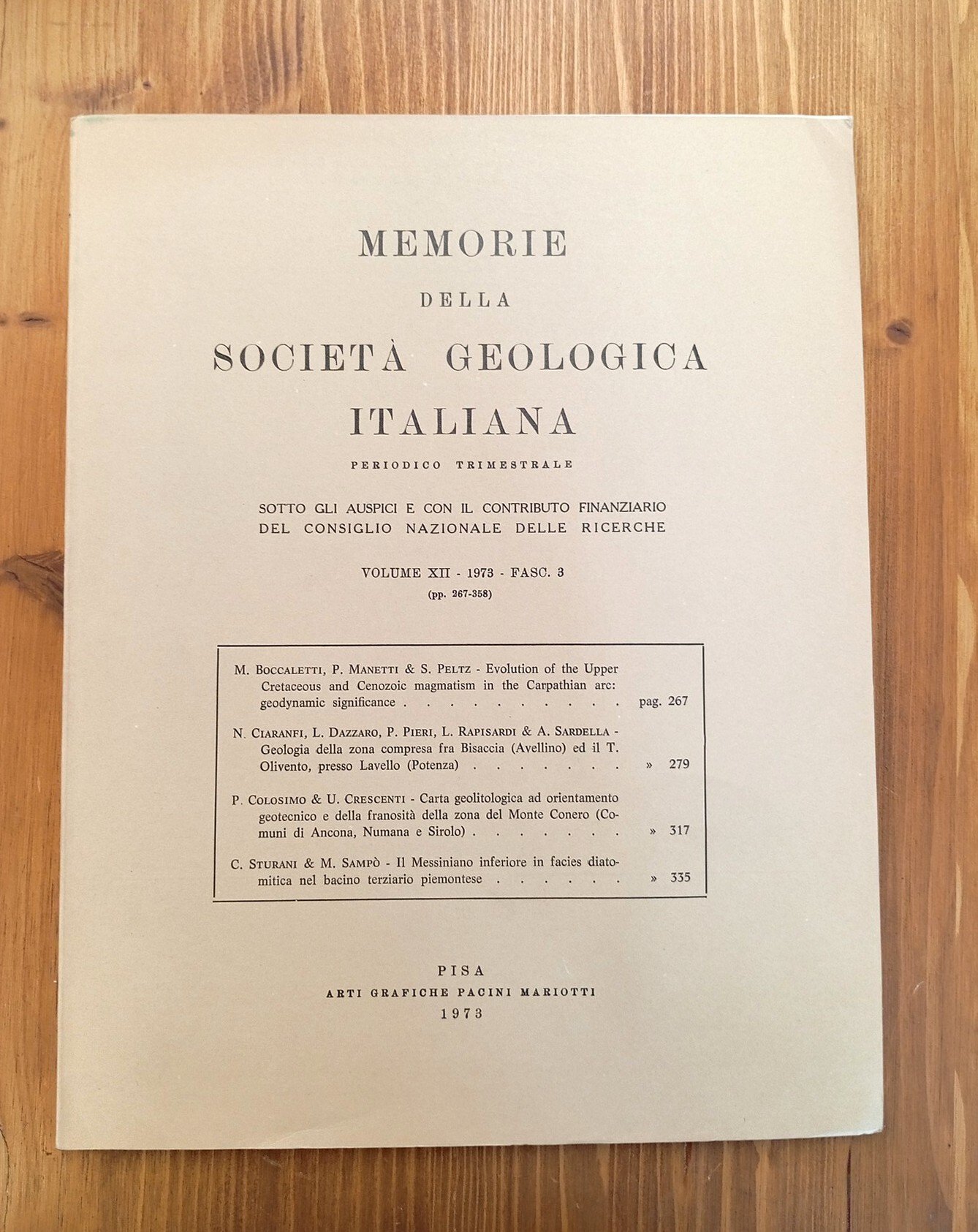 Brossura editoriale, pagine numerate da 267 a 358 con figure e grafici in nero nel testo e alcune tavole ripiegate (non sciolte); allegata inoltre, in apposita tasca, una carta a colori sciolta: Geologia della zona compresa fra Bisaccia (Avellino) ed il T. Olivento, presso Lavello (Potenza); carta geologica e sezioni. Ottimo esemplare di una pubblicazione non comune -- INDICE degli articoli: M. BOCCALETTI, P. MANETTI e S. PELTZ, Evolution of the Upper Cretaceous and Cenozoic magmatism in the Carpathian arc: geodynamic significance - N. CIARANFI, L. DAZZARO, P. PIERI, L. RAPISARDI e A. SARDELLA, Geologia della zona compresa fra Bisaccia (Avellino) ed il T. Olivento, presso Lavello (Potenza) - P. COLOSIMO e U. CRESCENTI, Carta geolitologica ad orientamento geotecnico e della franosità della zona del Monte Cancro (Comuni di Ancona, Numana e Sirolo) - C. STURANI e M. SAMPÒ, Il Messiniano inferiore in facies diatomitica nel bacino terziario piemontese