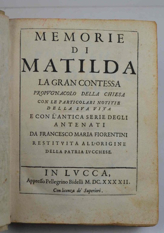 Memorie di Matilda la gran contessa propugnacolo della chiesa con le particolari notitie della sua vita e con l'antica serie degli antenati... restituita all'origine della patria lucchese. | Libri antichi e moderni | FIORENTINI FRANCESCO MARIA.