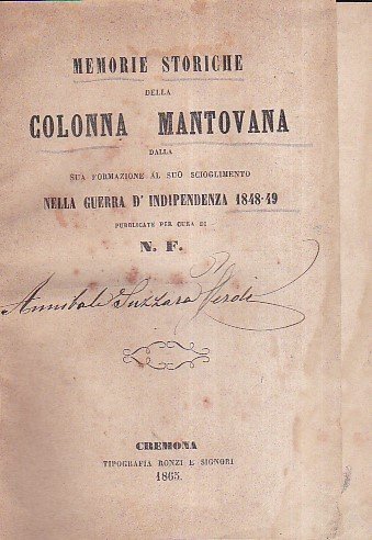 Memorie storiche della Colonna Mantovana dalla sua formazione al suo scioglimento nella Guerra d' Indipendenza 1848 - 49 pubblicate per cura di N. F.