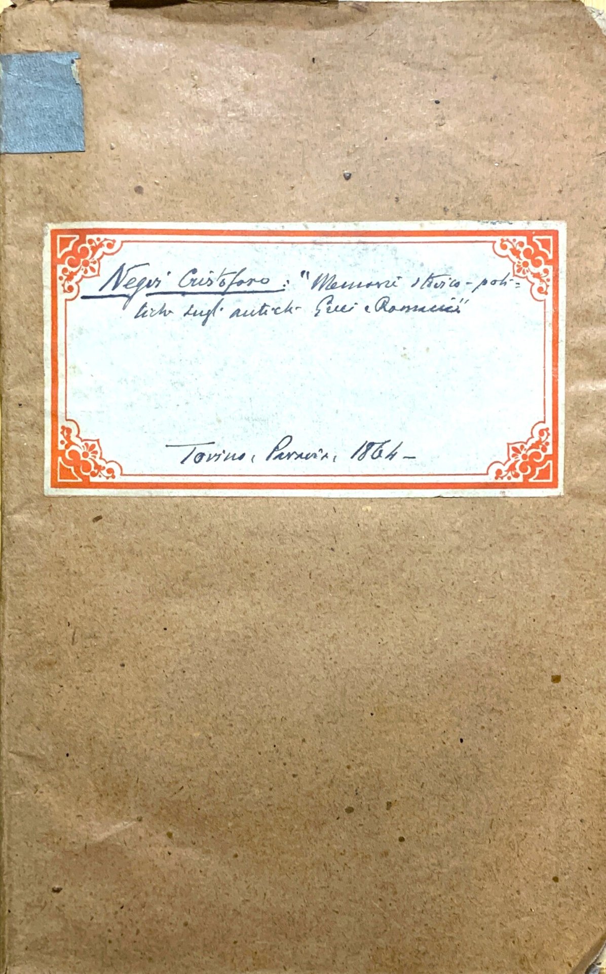 I ed. della raccolta (depositato il 31 ottobre 1864): "Le due prime Memorie del libro presentate furono da me composte nel 1842, ed inserite nella "Biblioteca Italiana" di Milano dell'anno medesimo. In allora i tempi erano tranquilli, nè le menti distolte dagli studi per agitazioni e predominio di passioni politiche. Quelle Memorie ebbero quindi lettori, ed incontrarono accoglienza molto favorevole, ma subirono il destino comune di tutti gli scritti che,, consegnati nei fogli o nelle opere periodiche sono rapidamente dagli scritti successivi incalzati nell''oblio. Io però continuai nei medesimi studi, ed ora le pubblico di nuovo moltissimo ampliate, anzi raddoppiate nel testo e nelle note, ma senza altyerazioni all'antica e sempre costante estimazione dei fatti, e senza variazione alle idee fondamentali, che dominavano dianzi, e tuttora dominano in entrambi i lavori. Ho poi aggiunto una terza Memoria antica pur essa nello studio e basi, benchè redatta di fresco" (Incipit della Prefazione dell'A., p. VII). VIII/ XVI+232/ brossura ricostituita in carta liscia écru con titoli entro etichette al primo piatto e al dorso (primo piatto: etichetta bianca con cornice floreale rossa e titoli ad inchiostro nero - dorso: etichetta in nastro adesivo in simil pelle grigia con titoli ad inchiostro nero). Stato mediocre (copertina originale mancante - cuciture allentate - pagine 17-24 con lunghi strappi diagonali anche riparati con nastro adesivo trasparente - pagine brunite e con fioriture). Indice: Prefazione - Quadro politico d'antica storia - Sulle vicende dell'interno diritto pubblico di Romas antica - La traslazione della capitale a Bisanzio e la capitale dell'impero occidentale. Indice: Prefazione; L'Autore (Torino, 22 ottobre 1864) - Quadro politico d'antica storia - Sulle vicende dell'interno diritto pubblico di Roma antica - La traslazione della capitale a Bisanzio e la capitale dell'impero in occidente.