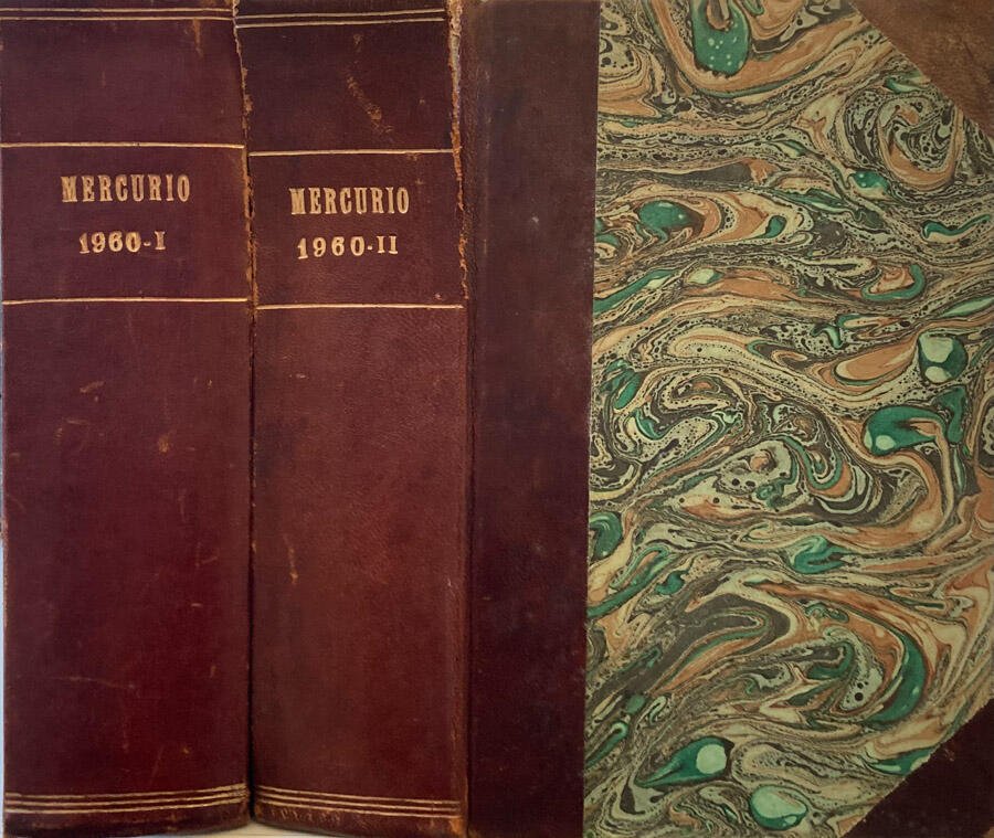 Eleganti volumi in similpelle contenenti la raccolta completa di riviste a uscita mensile Mercurio dell'anno 1960. I piatti marmorizzati mostrano lievissimi segni di usure da scaffale e piccole crettature dovute probabilmente al maneggiamento dei volumi nel tempo, mentre i dorsi, decorati e con titolo in oro, rivelano un distaccamento importante dell'estremità superiore e laterale in entrambi i volumi. I tagli si presentano bruniti e con leggere tracce di polvere mentre le pagine interne risultano pulite e ben conservate. Testo su due colonne e corredato di moltissime immagini sia a colori che in b/n. Opera curata da Giuseppe de Meo e Paolino La Corte, i due volumi contengono la rivista completa dal numero 1 del mese di Gennaio 1960 fino alla numero 12 del mese di Dicembre. Numero pagine N.N.