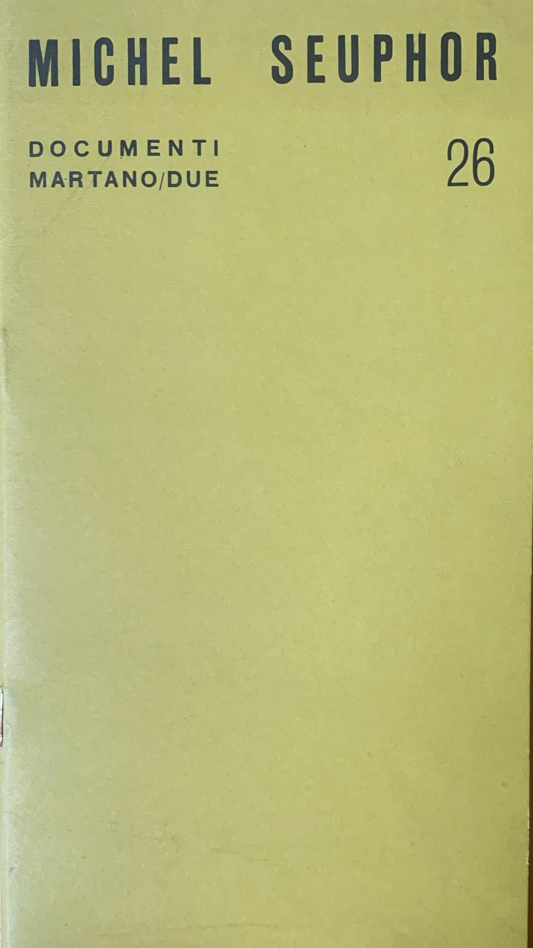 I ed., collezione "Documenti Martano/Due", vol. 26. Catalogo mostra personale dell' 'Orpheus', Torino - Martano/Due (Gallerie d'Arte Martano), settembre-ottobre 1970. Indice: scritto di Jean Arp in francese (prefazione alla mostra di Seuphor alla Galleria Berggruen, Paris 1954) - Il sistema e la regola; Michel Seuphor - Note inedite - Biografia - Mostre personali - mostre collettive - Opere esposte (disegni su carta - Disegni su carta colorata - Collages - Assemblages: per un totale di 39 opere). In-8, pp. (20), brossura verde oliva con titoli in nero al primo piatto fermata con due punti metallici al dorso. Con illustrazioni fotografiche in b/n (alcune delle opere esposte e ritratti dell'A.). Allegato l'invito alla serata dedicata all'A. (7.10.1970). Stato buono