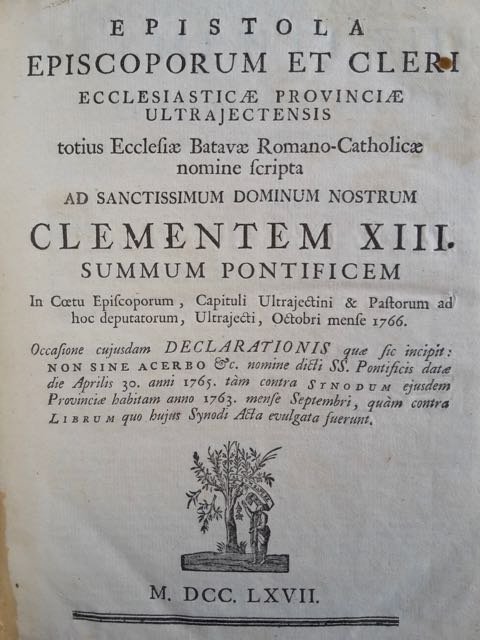 4 volumi in 1 in-4° (cm. 24,3), legatura coeva in p. pergamena con titolo al dorso (lievi usure); contiene: Epistola episcoporum et cleri ecclesiasticae provinciae ultrajectensis (1767); Lettre de M. l'Archeveque d'Utrecht et de MM. les Eveques de Harlem et de Deventer ses suffragans a M. l'Archeveque de Toulouse (1774); Lettre pastorale de monseigneur l'ill. et rev. Archeveque d'Utrecht (1768); Memoire sur l'état déplorable ou les jésuites ont réduit l'eglise, particulierement celle de France (1774). Carte in ottimo stato, un antico appunto ms. all'ultimo frontespizio; lieve bruniture. Buon esemplare. (SE2)