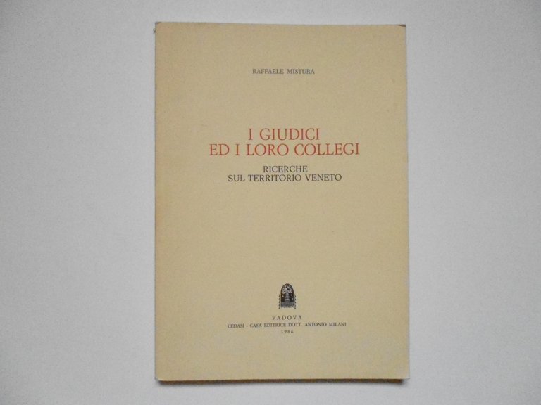 R. Mistura, I Giudici ed I Loro Collegi Ricerche Sul Territorio Veneto CEDAM, Padova, 1986. Cm 24x17, pp. 147. Cartoncino edit. color. panna. Condizioni di conservazione Esemplare in ottimo stato di conservazione. Aloni di gora al margine destro del fronte della coperta. Piega all'angolo sup. destro del fronte della coperta. Non comune. SETT72.L20931G
