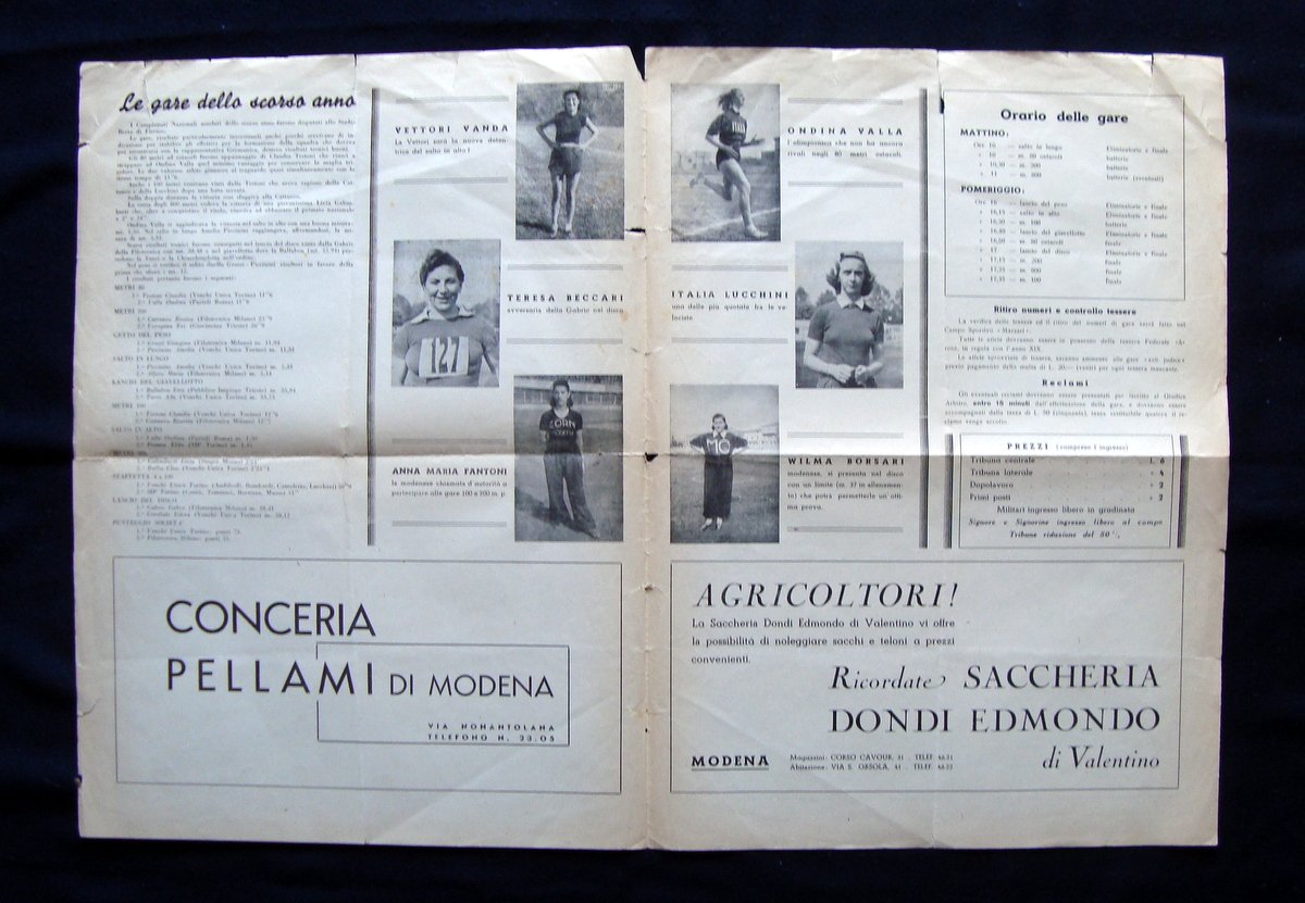 Rivista, Campionati Nazionali Assoluti Atletica Leggera femminile Numero Unico STADIO C.MARZARI Modena, 13 luglio XIX Uff.Stampa Dopolavoro Prov.Modena, 1941; cm 44x32, pp.4 (bifolio) Numero Completo Condizioni di conservazione Esemplare in discrete condizioni con tracce d'uso, pieghe di conservazione, dorso e margini con bruniture e strappetti, per le condizioni vedi foto. Numero completo. SC03.D14621F blu