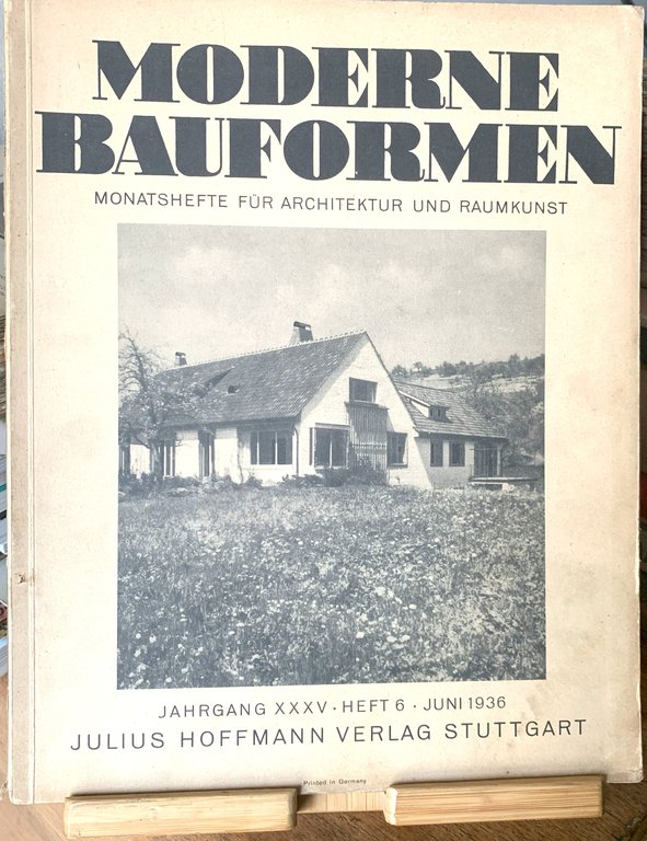I ed.. Jahrgang XXXV, Heft 6, Juni 1936 (rivista mensile). Testi in tedesco. IV/297-356+69-80+(4) non rilegate con traduzioni in inglese e francese/brossura illustrata in b/n (al primo piatto: Moser & Kopp, Zürich. Drei Landhäuser in der Schweiz). Con illustrazioni in b/n e a colori. Stato buono (usura della copertina e delle pagine ai margini e, per quanto riguarda la copertina, dorso consunto - copertina e pagine brunite). Inhalt: Elendsviertelsanierung. Von Baurat Herbert Boehm, Frankfurt a. M. - Gaststätten und Unterkünte im Gebirge (Otto Heydecker, Kempten in Allägau. Gasthäuser in Reichenbach und Oberstaufen im Allägau - Hans Volkart, Stuttgart. Das Harpprechthaus der Sektion Schwaben des Deutschen u. Oesterr. Alpenvereins) - Fünf Einfamilienhäuser auf dem Lande (Hans Volkart, Stuttgart. Haus K. bei Stuttgart - Moser & Kopp, Zürich. Drei Landhäuser in der Schweiz - Hans Heinz Lüttgen, Köln a. Rh. Ein Landhaus in Sachsen) - Farbige Raumentwürfe (Walter v. Breunig, München. Fensterpartie in einem Frühstückszimmer - Walter v. Breunig, München. Wintergarten mit hinausstellbaren Fenstern) - Mitteilungen aus der Fachwelt (Neue Gartenbücher S. 69, Wettbewerbe S. 70, Zeitschriftenschau S. 72, 74, 76, Stellenmarkt S. 79).