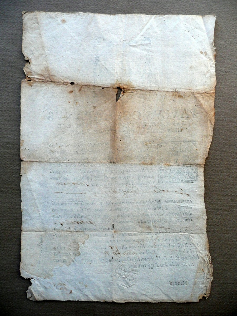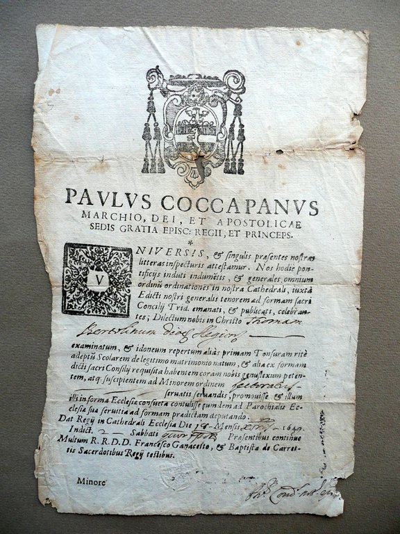 Modulo, Paulus Coccapanus Marchio, Dei, et Apostolicae Sedis Gratia Episc. Regii, et Princeps - Modulo per idoneità alla tonsura, ovvero per il conferimento degli ordini sacri 1649 1649; modulo a stampa su foglio in carta; sezioni bianche compilate manualmente (compilazione d'epoca, vedi foto); bel capolettera e stemma vescovile incisi. Cm 29x19. Testo in latino. Condizioni di conservazione Esemplare in condizioni più che discrete con tracce d'uso e del tempo; leggere tracce di pieghe di conservazione; alcune piccole lievi bruniture; qualche leggera ombra di gora le quali non compromettono la lettura del testo; alcune piccole / minime mancanze (vedi foto). SC03.D12179 N