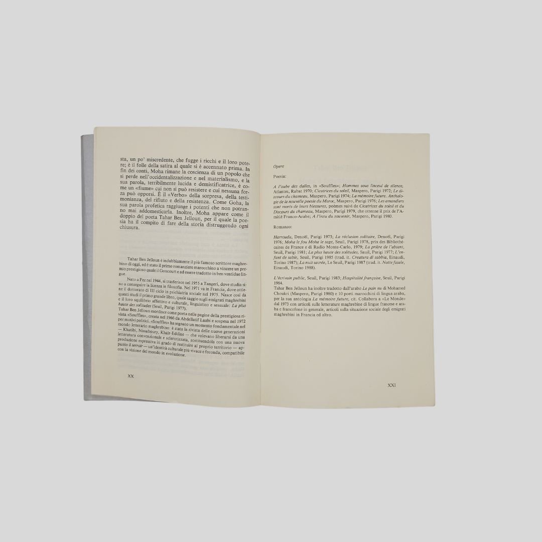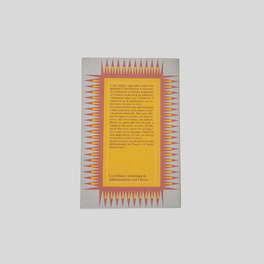 In-8° (cm 20), pp. 156 [2]. Collana: Il lato dell’ombra, 13. In buone condizioni. Moha il folle, Moha il saggio: un canto visionario sulla dignità degli ultimi. Attraverso la voce di Moha — mendicante, profeta, folle lucido — Tahar Ben Jelloun costruisce un monologo potente e poetico che dà parola a chi non ne ha: oppressi, emarginati, vittime dell’ingiustizia. Un romanzo breve e incendiario, sospeso tra poesia e denuncia, dove la follia diventa l’unica forma possibile di verità.