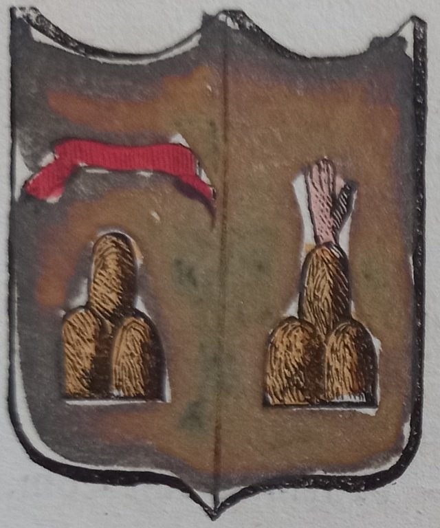 Piccolo stemma comunale colorato a mano d’epoca (cm. 3,8 x 3,2 ca.). Stralcio dal Dizionario Corografico illustrato dell’Italia, edito a Milano nel 1868. Ogni stemma di questa raccolta è inserito in una o più pagine di testo con la descrizione della località, notizie storico - geografiche e statistiche (numero degli abitanti e degli elettori, guarnigioni della Guardia Nazionale, ecc.). Spesso il testo è redatto da studiosi locali o dai sindaci, con maggiori, interessanti notizie.