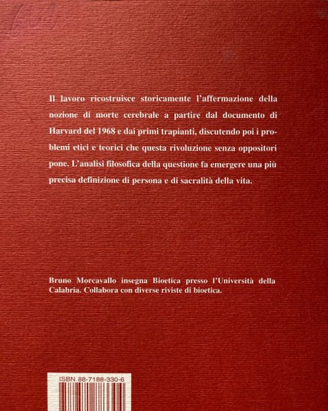 L'autore affronta in questo saggio i problemi etici di fine vita convinto che il pensiero laico debba proporre un contributo che tolga al Magistero ecclesiale il monopolio della discussione sull'importanza della vita. Il lavoro ricostruisce storicamente l'affermazione della nozione di morte cerebrale, a partire dal documento di Harvard del 1968 e dai primi trapianti e discutendo i problemi etici e teorici di questa "rivoluzione senza oppositori".