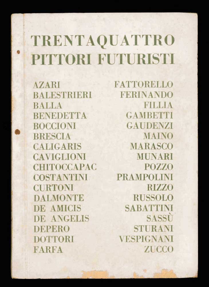 - Aa. Vv. (Marinetti, F.T. - Azari, F. - Balestrieri, L. - Balla, , G. - Benedetta - Boccioni, U. - Brescia, U. - Caligaris, A.C, - , Caviglioni A.- Chitoccapac - Costantini, G. - Curtoni, P. - Dalm, Onte, M. - De Amicis, L. - De Angelis - Depero, F. - Dottori, G., - Farfa - Fattorello, L. - Ferdinando, B. - Fillia - Gambetti, , D. - Gaudenzi, A. - Maino, A. - Marasco, A. - Munari, B. - Pozzo, , U. - Prampolini, E. - Rizzo, P. - Russolo, L. - Sabattini, F.-, Sassu, A. - Sturani, M. - Vespignani, G. - Zucco, M.)