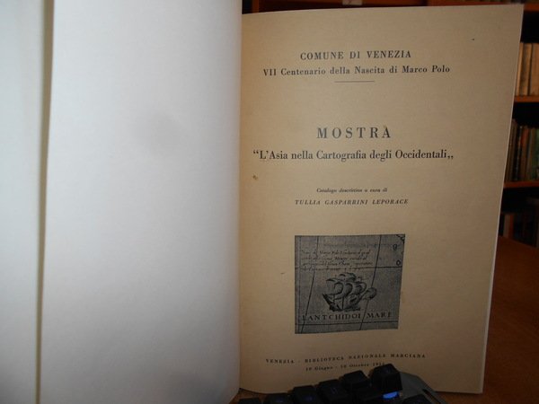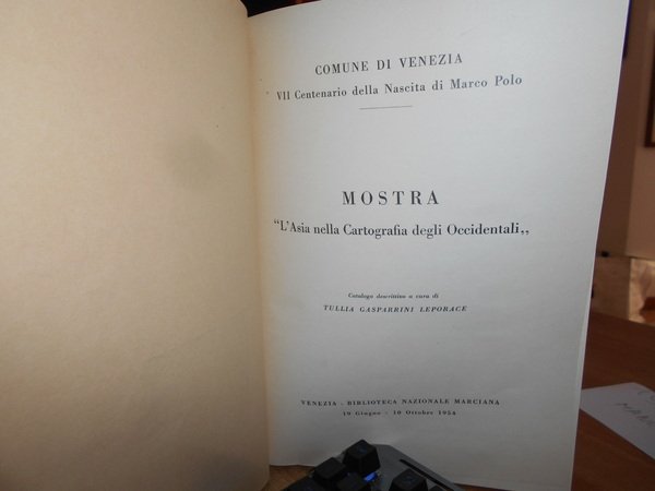 Catalogo descrittivo a cura di TULLIA GASPARRINI LEPORACE. Venezia, Officine Grafiche F. Garzia, 1954. MOSTRA "L' Asia nella Cartografia degli Occidentali". Comune di Venezia VII Centenario della Nascita di Marco Polo. In-4° piccolo, tela con titolo in oro entro tassello al dorso, brossure originali conservate. (iv), 95 pp. con 31 tavole stampate su carta patinata f.t. Perfetto esemplare in legatura artigianale anni '70 con le brossure originali conservate. Uff. B - II - 7 - 2