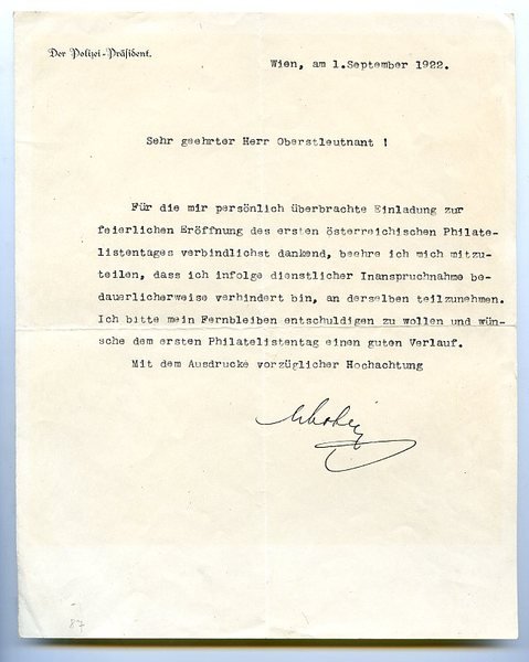 ¾ S. 4to. An den namentlich nicht genannten Maler und Graphiker Ludwig Hesshaimer (1872-1956): "Für die mir persönlich überbrachte Einladung zur feierlichen Eröffnung des ersten österreichischen Philatelistentages verbindlichst dankend, beehre ich mich mitzutheilen, dass ich infolge dienstlicher Inanspruchnahme bedauerlicherweise verhindert bin, an derselben teilzunehmen [.]". - Seit 1918 Polizeipräsident von Wien, wurde der umstrittene Politiker 1921 vom Nationalrat zum Bundeskanzler gewählt; andere hohe Funktionen bekleidete Schober als Vizekanzler und Außenminister. - Auf Briefpapier mit gedr. Briefkopf des Polizeipräsidenten.