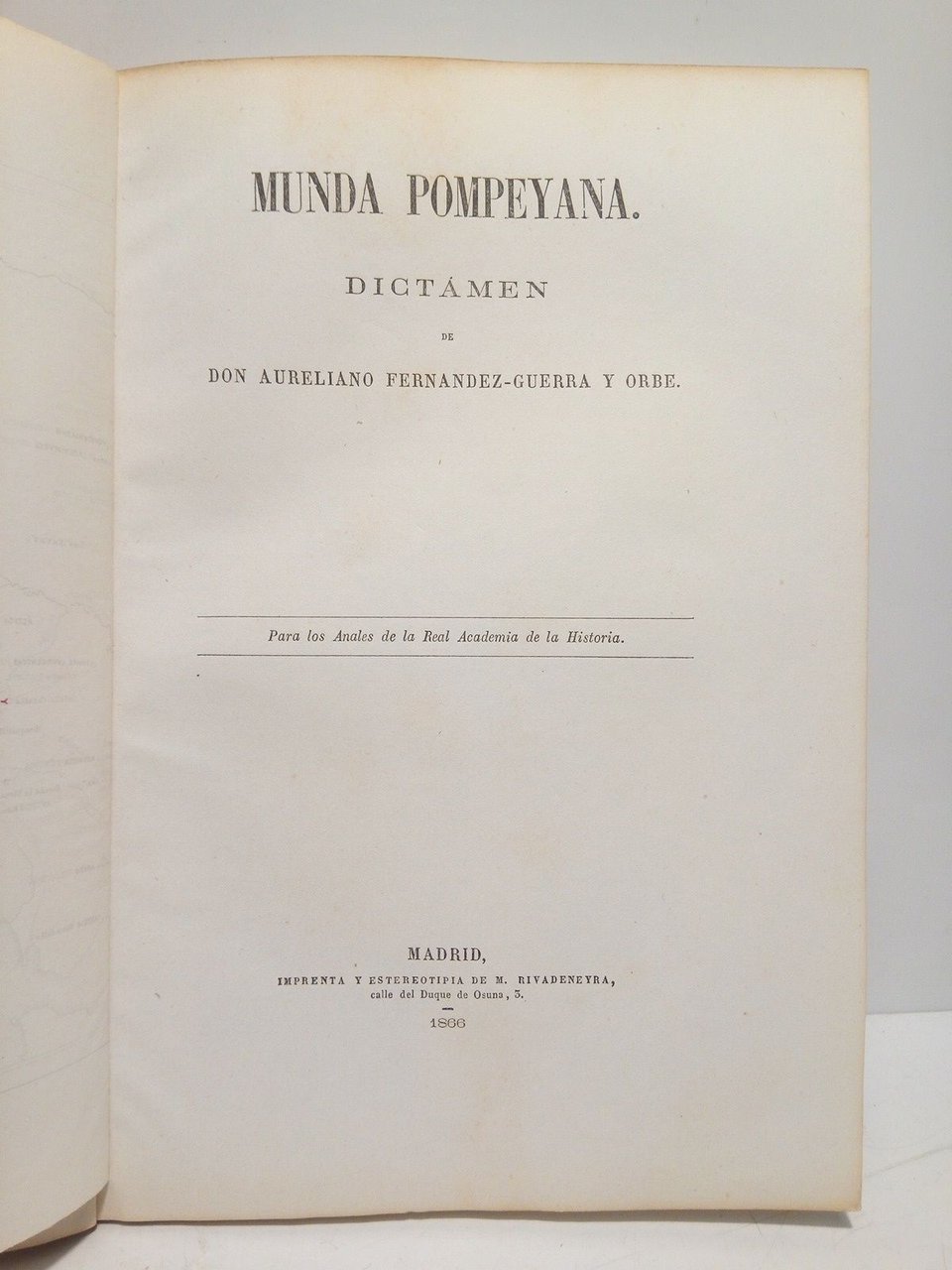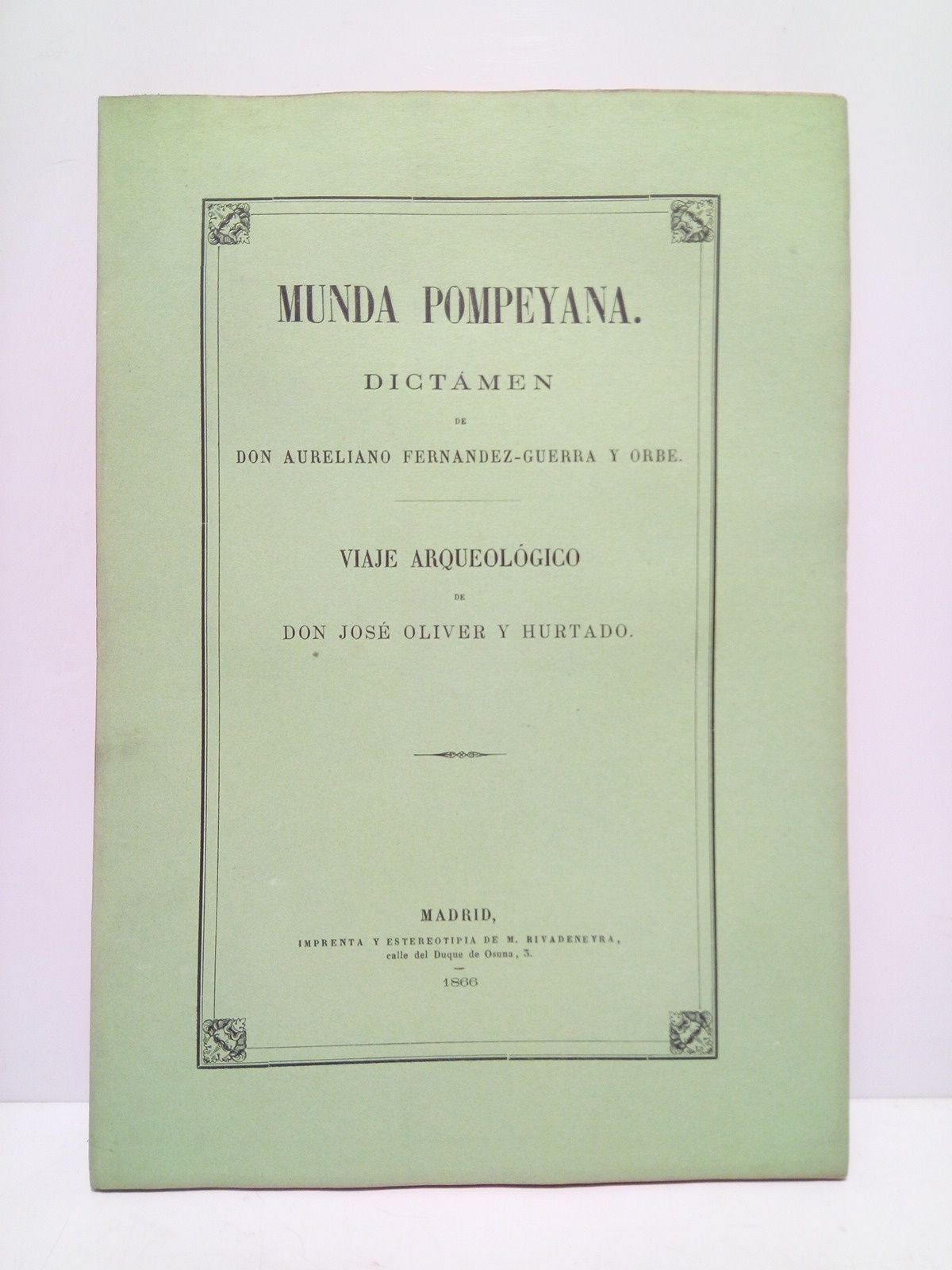Munda Pompeyana / Dictamen de Don Aureliano Fernández-Guerra y Orbe, para los Anales de la R. Academia de la Historia [y] Viaje arqueológico emprendido en el mes de Mayo de 1854, de orden de la R. Academia de la Historia, por Don José Oliver y Hurtado | Libri antichi e moderni | Fernandez-Guerra Y Orbe, Aureliano, José Oliver Hurtado