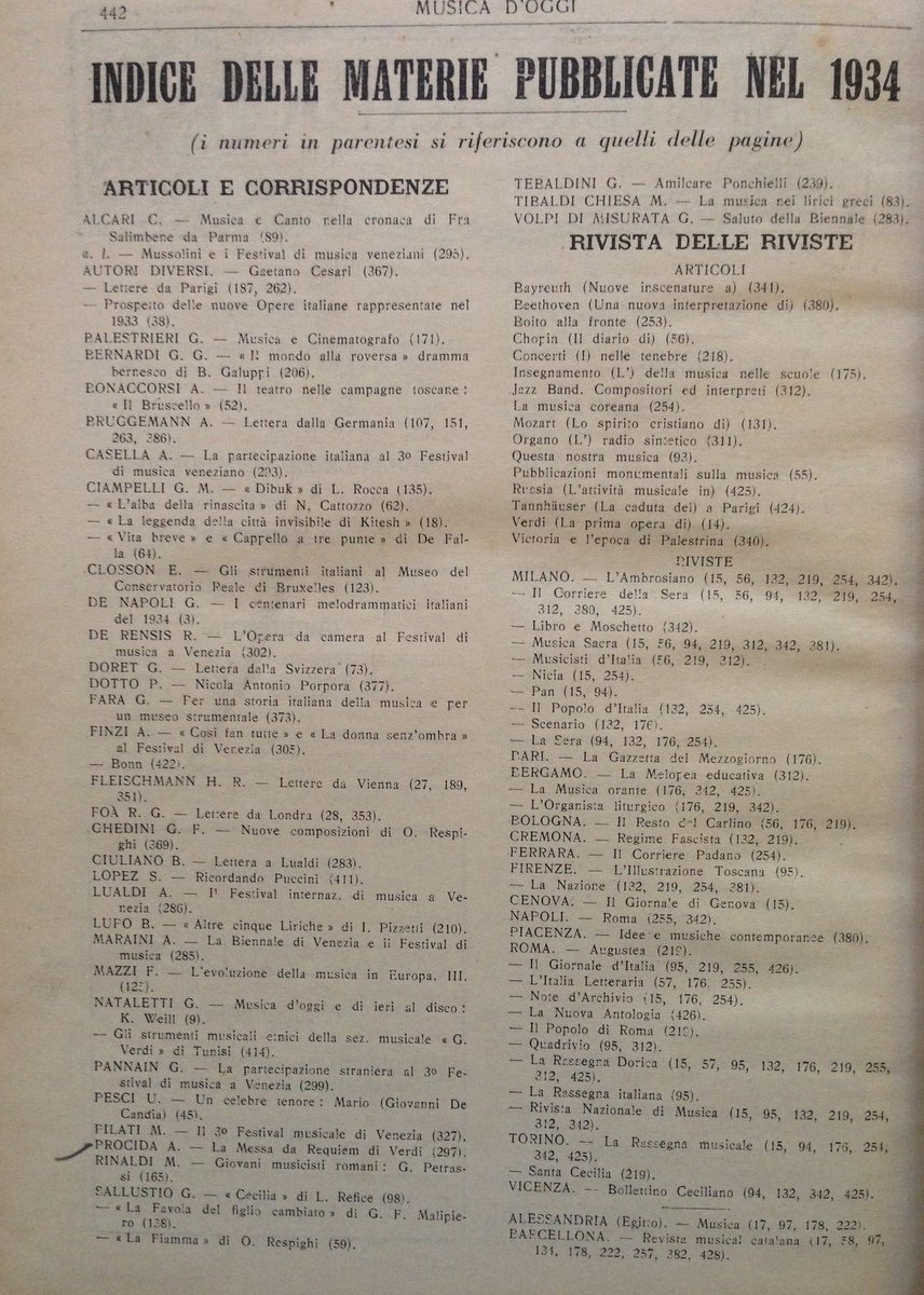 Musica d'Oggi, Rassegna di vita e di coltura musicale Anno1934 - 12 numeri Musica d'oggi 1934, cm. 24x17, pp. 444, con qualche ill. in b/n n.t. e a p.pag., 12 numeri rilegati in un unico tomo, cartonato ed. ill. Condizioni di conservazione Esemplare in buono stato con leggere tracce d'uso; piatti e dorso con leggere abrasioni e macchiette; interni buoni leggermente bruniti con qualche raro segno a matita, piccolo strappetto all'angolo superiore ultima pagina. SETT127.L12485 MT