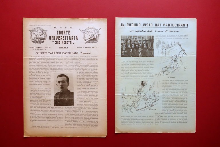 Rivista, M.V.S.N. Coorte Universitaria Ciro Menotti" Foglio numero 4 Modena, 18 febbraio 1942 Soc. Tipografica Modenese, Modena 1942; cm 35x25; pp. non num. (bifolio di pp. 4). Numero completo, con accluso inserto dedicato al raduno sciistico di Bardonecchia e alla squadra di Modena che vi partecipò (bifolio ill. in b/n). Condizioni di conservazione Esemplare ben conservato con tracce d'uso, un paio di leggere tracce di pieghe di conservazione, margini e angoli con lievi accenni d'ingiallimento dovuti al tipo di carta e con pochi minuscoli strappetti. Inserto anch'esso ben conservato con tracce d'uso, lievi tracce di pieghe di conservazione, margini con minimi accenni d'ingiallimento dovuti al tipo di carta. Numero completo, con accluso inserto dedicato al raduno sciistico di Bardonecchia e alla squadra di Modena che vi partecipò. SC03.D18637 N F "