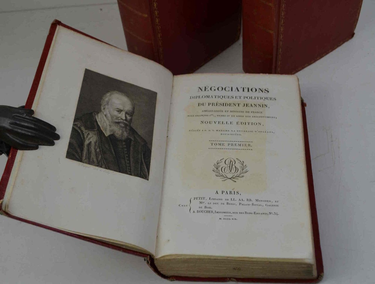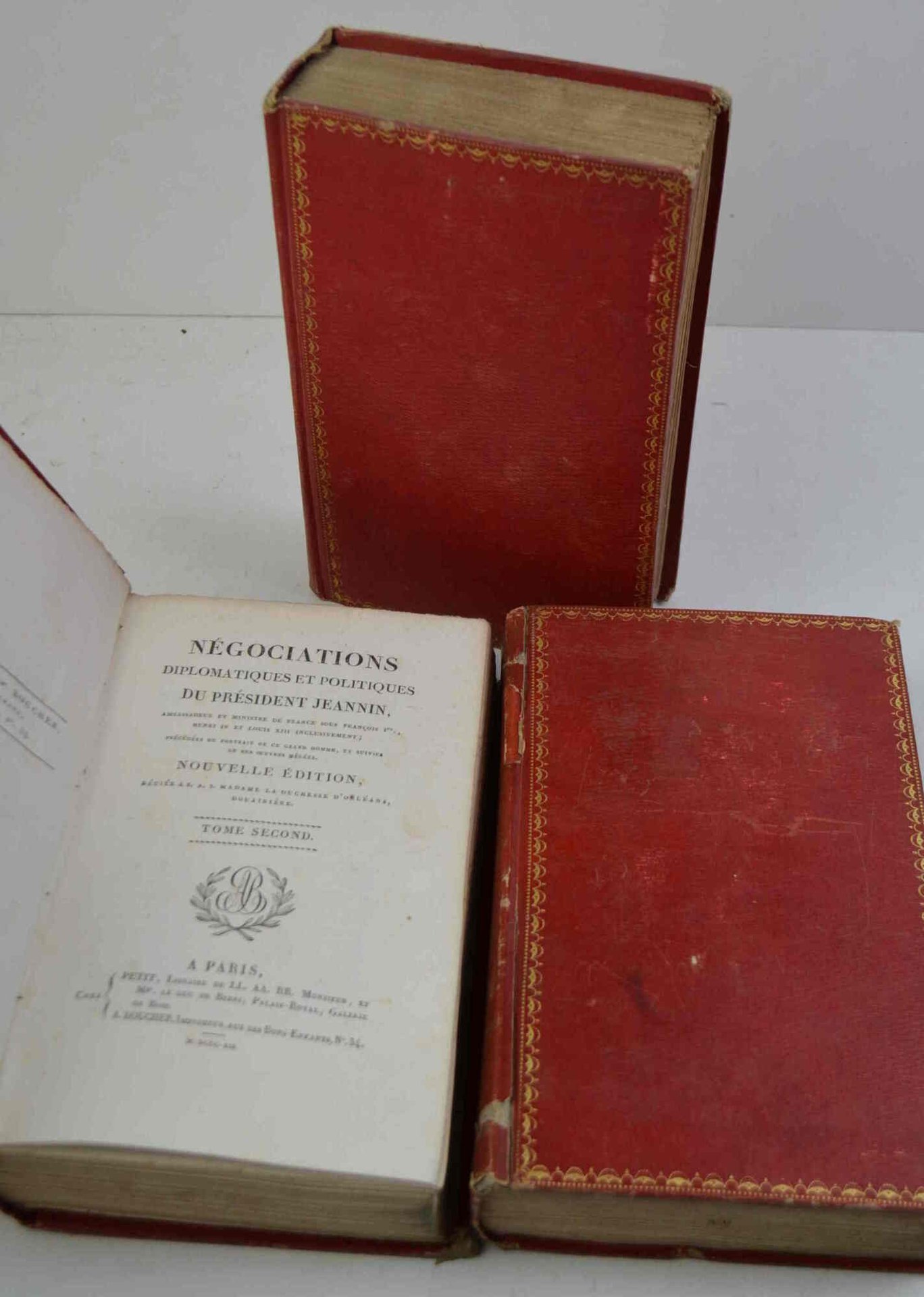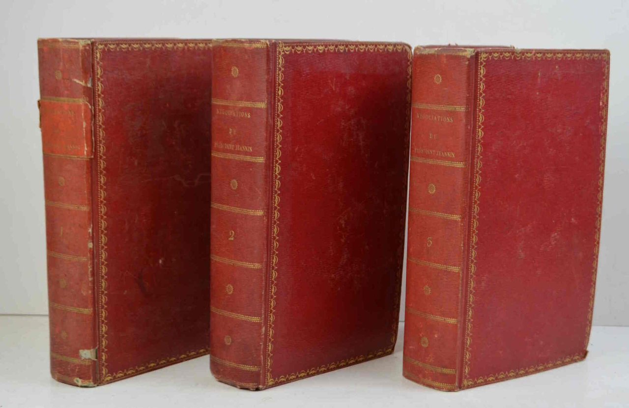 Tre volumi di cm. 22, pp. vii (1) 566, 608, 660. Ritratto dell'autore inciso all'antiporta del primo volume. Elegante legatura coeva in cart. rigido rosso zigrinato con fregi e titoli in oro ai dorsi e piatti inquadrati da cornici in oro (Zezzio relieur di Rarigi). Begl'ex libris incisi a ciascun volume (Monsieur de Buchelet). Firma ms. dell'autore al verso di un occhietto. Minimi segni d'uso, ma esemplare marginoso, a carte candide ed in eccellente stato di conservazione. Stimata edizione di quest'opera che fu a lungo considerata come un piccolo capolavoro d'arte diplomatica. L'autore du sovrintendente delle Finanze dal 1616 al 1619 con Maria de Medici. Cfr. Quérard IV, 221