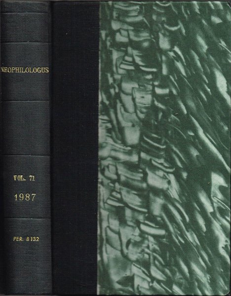 Anno 1987 completo composto dai NN. 1, gennaio, 2, aprile, 3, luglio, 4, ottobre, rilegati in un unico tomo, Volume LXXI del periodico trimestrale Neophilologus - An International journal of modern and mediaeval language and literature. Ottimo stato, volume rilegato con coperta in mezzatela con angoli, piatti marmorizzati, sul dorso caratteri dorati in bassorilievo, minimi segni d'uso, cerniera stretta, taglio di testa con accenno di fioritura, pagine in ottimo stato. Il rilegatore ha mantenuto all'interno del volume il piatto anteriore originale di ogni fascicolo, in cartoncino patinato, catalogazione bibliotecaria manoscritta. Presenta talloncino adesivo di legatoria su risguardia, timbro ex biblioteca ed appunto a matita su frontespizio, timbro ex biblioteca sul margine di piede di alcune pagine, timbro numerale a pagina 1; al Fasc. N. 3 allegato foglietto editoriale illustrato di 4 pagine. Lingue: Inglese, Olandese, Francese. Numero pagine 637, numerazione delle pagine in sequenza
