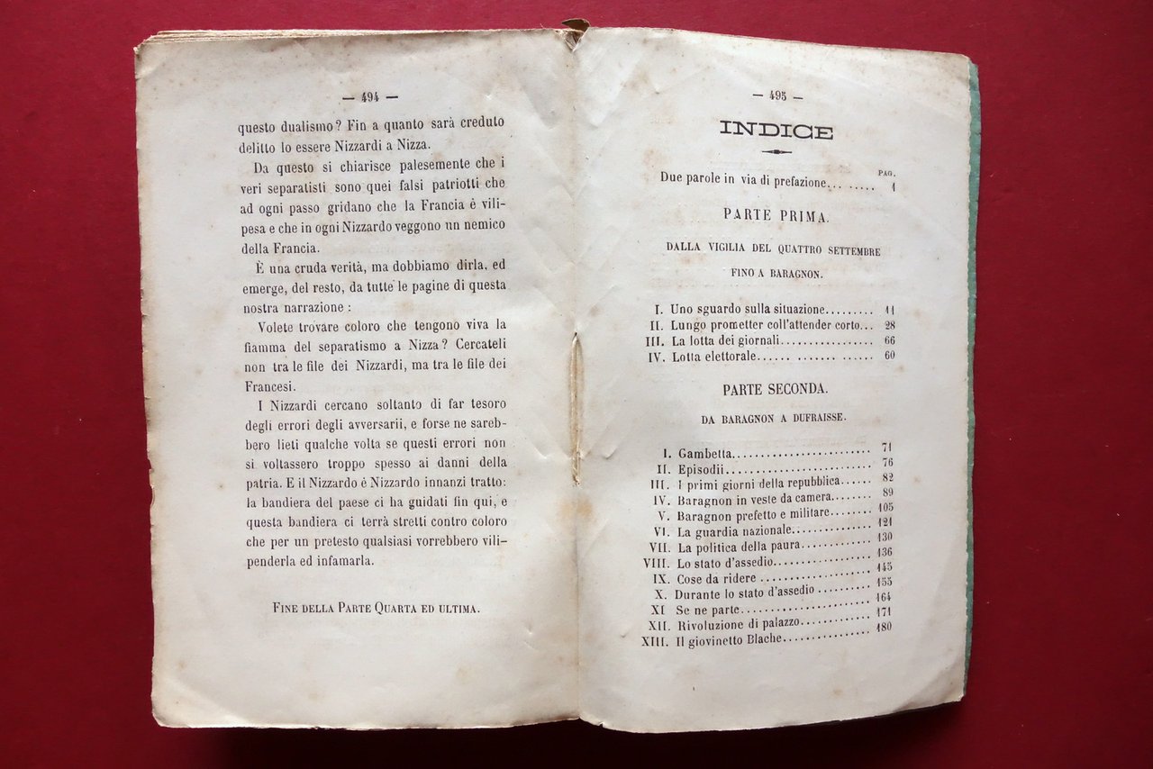 Giuseppe Andrè, Nizza negli ultimi quattro anni per Giuseppe Andrè Tipografia e Litografia A. Gilletta, Nizza 1875; cm 18,5x12; pp. 496; brossura ed. Condizioni di conservazione Condizioni più che discrete con tracce d'uso, dorso fessurato con conseguente distacco dell'esemplare in due metà peraltro compatte (vedi foto); minimi strappetti alle cuffie; brossura ed. con leggere tracce di sporco. Interni buoni con alcune piccole leggere bruniture. Testimonianza sui Vespri nizzardi, i moti antifrancesi e filoitaliani del 1871. Rara edizione originale del 1875. SETT228.L24105 N