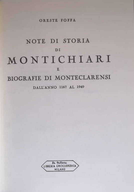 NOTE DI STORIA DI MONTICHIARI E BIOGRAFIE DI MONTECLARENSI. - Dall'anno 1167 al 1949. | Libri antichi e moderni | FOFFA Oreste