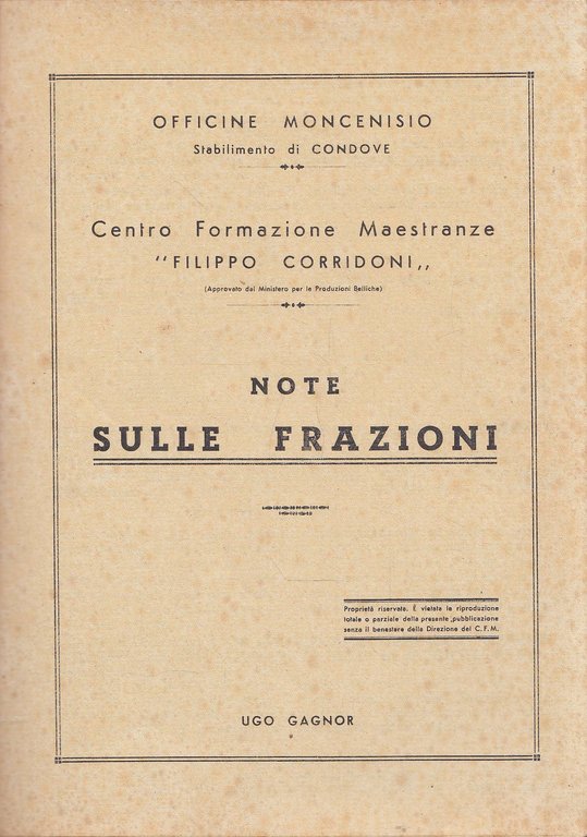 OFFICINE MONCENISIO, Stabilimento di CONDOVE, Centro Formazione Maestranze FILIPPO CORRIDONI (Approvato dal Ministero per le Produzioni Belliche). Brossura a punto metallico, 21,5x28 cm, 37 pg. Buone condizioni.