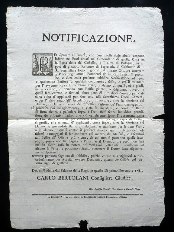 Notificazione, Notificazione Per riparare ai Danni, che con intollerabile abuso vengono inferiti ne'Prati situati nel Circondario di questa Città fra la Porta detta del Castello, e l'altra di Bologna, in vigore di grazioso Rescritto di Segreteria di Gabinetto di S. A. Serenissima [.] si proibisce, e vieta colla presente pubblica Notificazione ad ogni, e qualunque Persona di qualsiasi condizione, sesso, o età il transitare per l'avvenire sopra li medesimi Prati [.]" Per gli Eredi di Bartolomeo Soliani Stampatori Ducali, Modena 1781, cm 42,5x30,5, margini alla forma, bel capolettera inciso. Condizioni di conservazione Esemplare in buone condizioni con tracce d'uso, normale piega centrale di conservazione, qualche piccola lieve brunitura; margine inf. con una piccola mancanza; un margine est. con uno strappetto di qualche cm in corrispondenza della piega centrale (vedi foto). SC03.D10684 N "