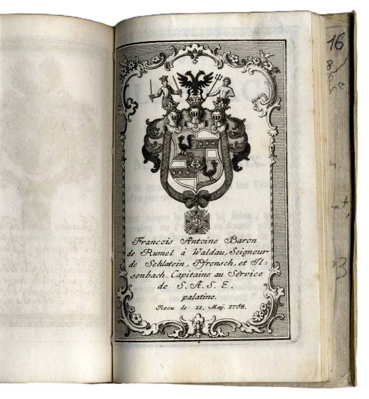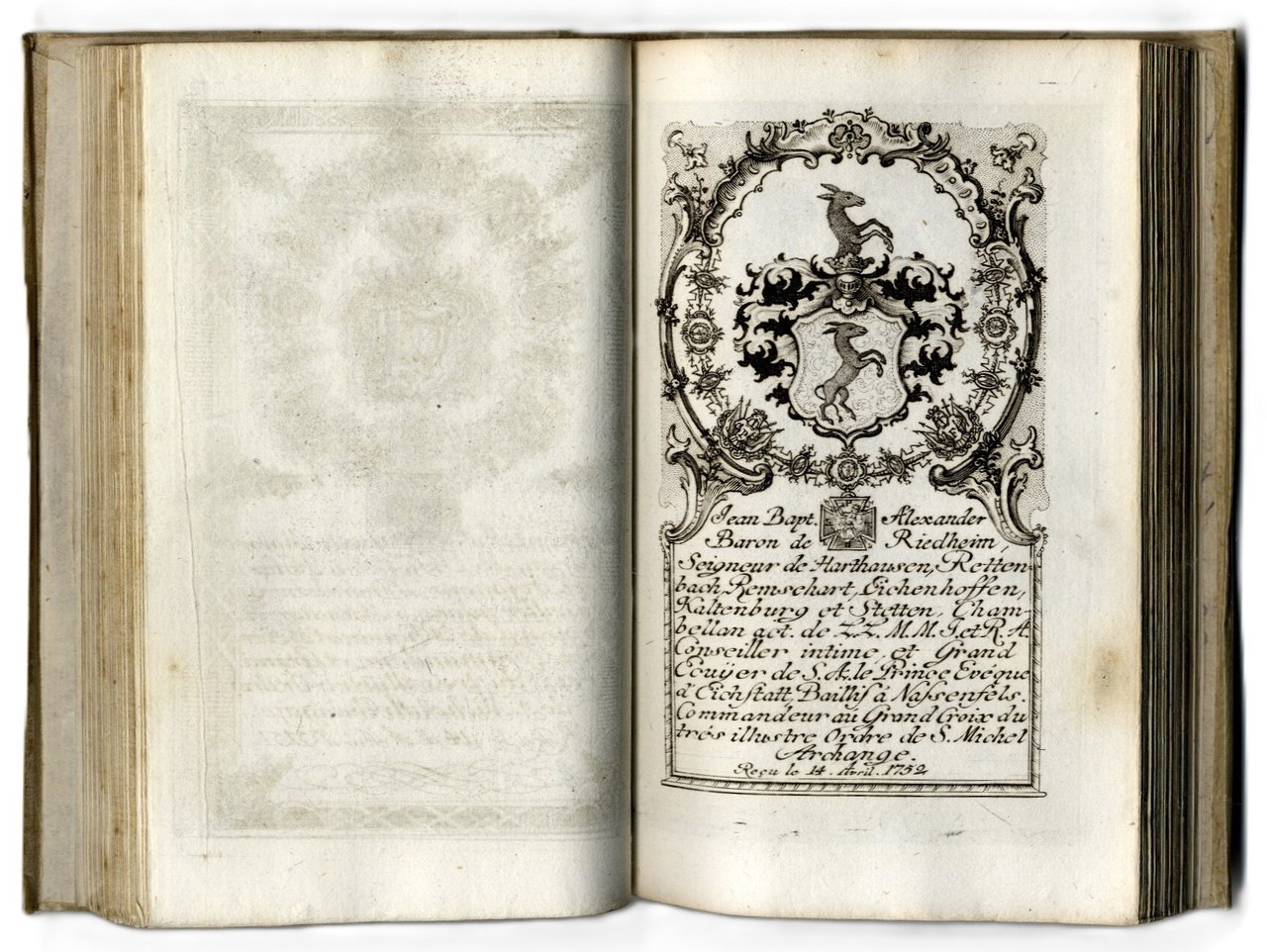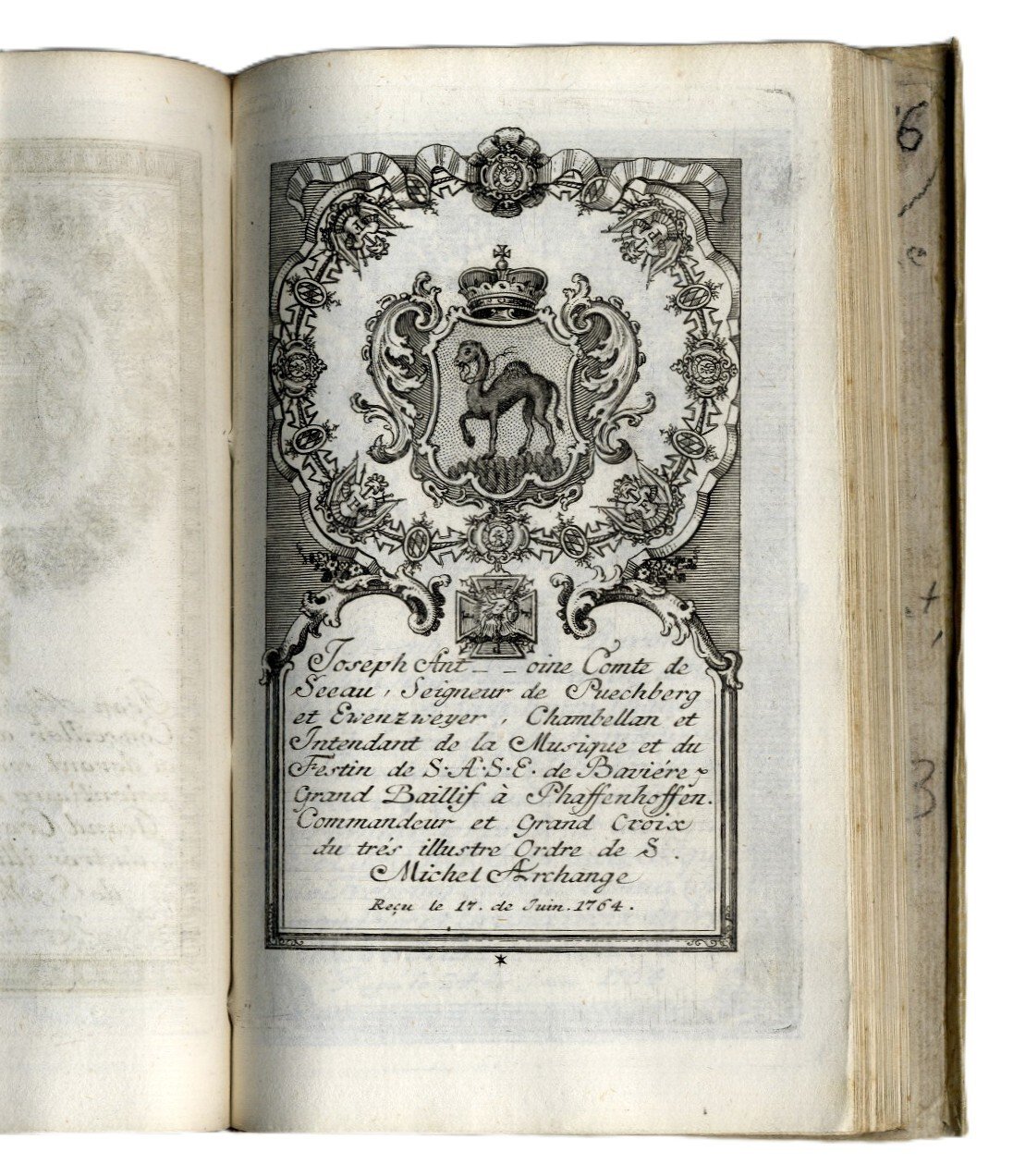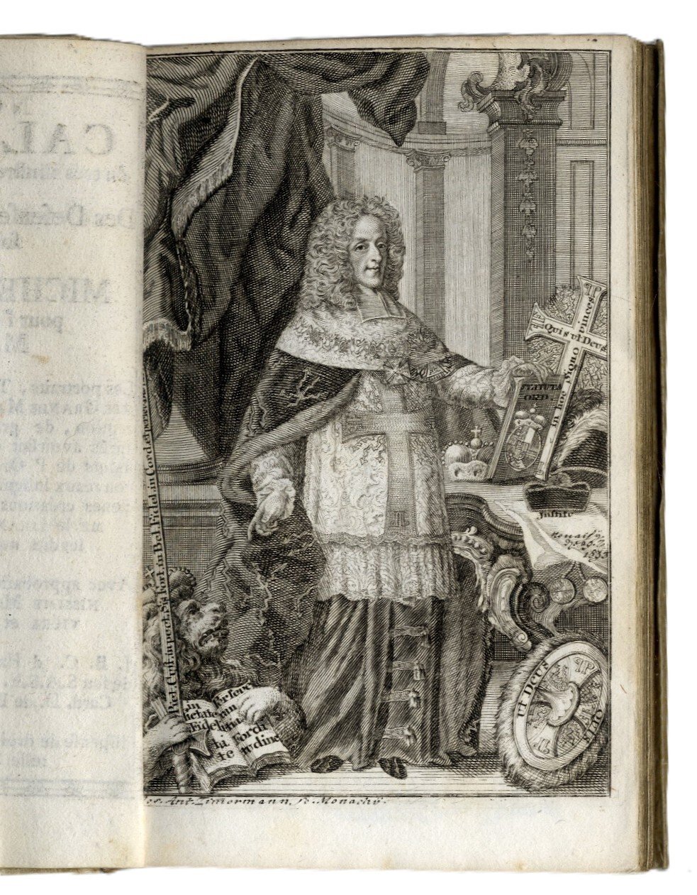 >in-12, 19 ff. di testo a stampa (5 preliminari e 14 in fine), leg. posteriore in p. perg. Corredato da 103 bellissime incisioni a piena pagina, di cui 3 singole ed una doppia con i ritratti dei Maestri del Gran Ordine; le restanti tavole, disposte cronologicamente, raffigurano le armi araldiche e i titoli degli appartenenti all'ordine; tutte le pagine, inoltre, sono entro bordure. Si tratta di un rarissimo ed elegante calendario araldico per l'anno 1769, superbamente inciso da Joseph Anton Zimmermann e probabilmente da Max Jungwierth, dei cavalieri dell'Ordine di San Michele Arcangelo, dinastico della Casa di Baviera: di ciascuno, con brevi notizie biografiche, è raffigurato lo stemma con elmo o corona e spesso più di un pittoresco cimiero, ne sono descritti dignità e cariche ricoperte, oltre alla data di ricezione nell'ordine, fondato nel 1693. In fine almanacco con la data delle principali festività: quelle dell'ordine sono evidenziate con un asterisco. Delizioso volumetto, perfettamente conservato, firma di possesso sbiadita al titolo.  Manca al Carteret, Les Almanacs. Manca a Saffroy.