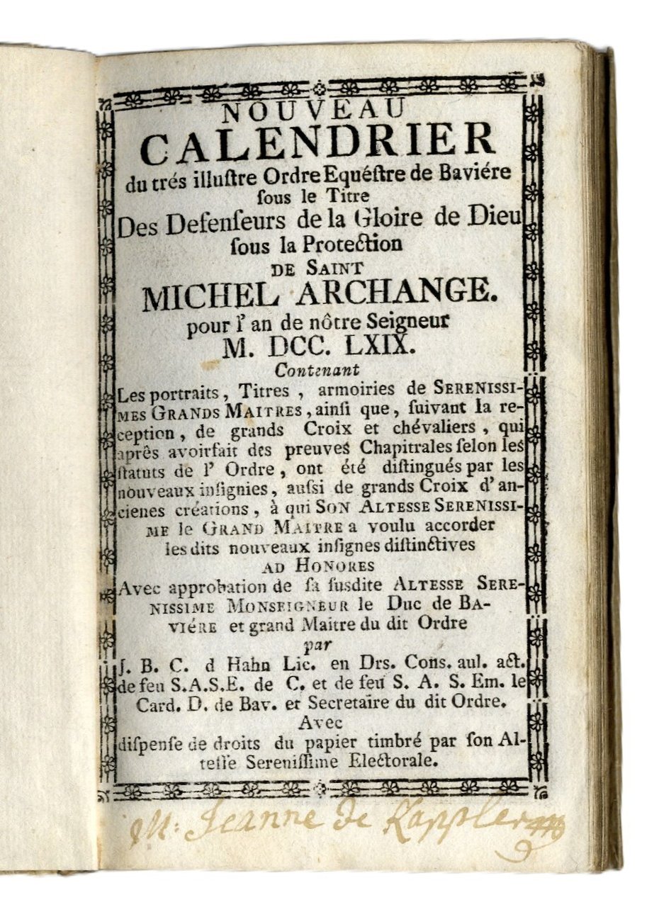 Nouveau Calendrier du trés illustre ORDRE EQUESTRE DE BAVIERE sous le Titre des Defenseurs de la Gloire de Dieu sous la Protection de saint Michel Archange. | Libri antichi e moderni | HAHN, J. B. C. D.