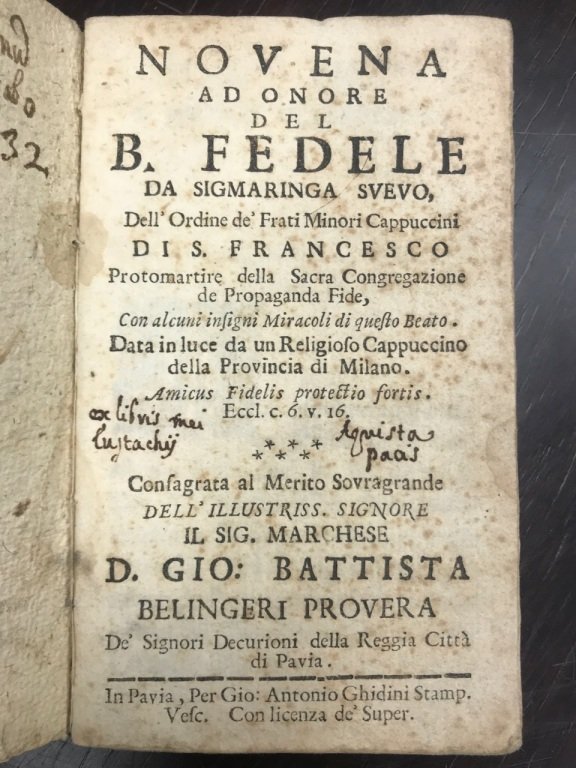 In-12° (cm. 13,6), legatura coeva in cartonato alla rustica, pp. 91 [5b] in buono stato, con antiche firme di appartenenza al frontespizio e al contropiatto; sporadiche fioriture. Opera dedicata al pavese Giovanni Battista Belingeri Provera. Il cappuccino Fedele da Sigmaringen fu beatificato nel 1729, poi proclamato santo da papa Benedetto XIV nel 1746. Buon esemplare. (SL2)
