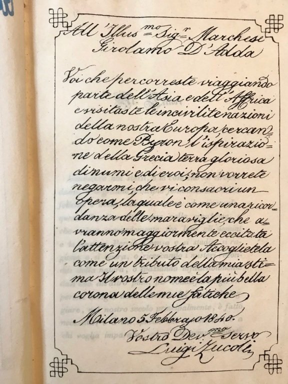 In-16° (cm. 16,4), legatura coeva in tutta tela (lievi segni d'usura), tagli spruzzati; pp. CXIV [2] 525 [3] in ottimo stato, prive di apparato iconografico dall'origine (eccetto la Gran Madre di Dio di Torino f.t.); aggiunta una tavola f.t. di dedica speciale dello Zucoli al marchese<span style="font-size: 10pt;"> Girolamo D'Adda, pure bibliofilo; nota di appartenenza al frontespizio. Buon esemplare. (NG2)</span>