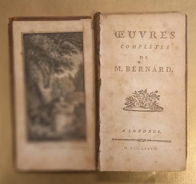 Testo francese. Cm.11,7x6,4. Pg.204. Legatura coeva in piena pelle con fregi in oro al dorso. Tagli in oro. Fogli di guardia marmorizzati. Tracce d'uso e piatto anteriore staccato. Invasiva dedica a penna all'occhiello. Una incisione all'antiporta. Pierre Joseph Justin Bernard (Grenoble, 1708-1775), svolse l'attività militare, alternandola a quella letteraria. Chiamato il "gentile" Bernard da Voltaire, scrisse versi erotici e compose svariati testi per le musiche di Rameau, oltre a tradurre l'"Ars amatoria" di Ovidio. Codice libreria 173109.