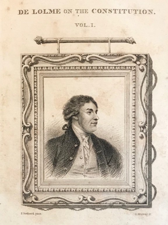 2 volumi in 1 in-16° (cm. 12,7), legatura coeva in mezza pelle e angoli, titolo e filetti in oro al dorso (macchioline); pp. 214, 216 con doppio frontespizio illustrato a ciascun tomo (ritratto e vignetta incisi da Murray su disegno di Stofhard); lievi fioriture sparse. Buon esemplare di un'opera che alla sua prima edizione francese (1771) aveva costretto l'autore alla fuga in Inghilterra nonché influenzato la costituzione degli Stati Uniti d'America. De Lolme propugnava una forma di governo costituzionale, elogiava la democrazia rappresentativa e sollecitava l'estensione del suffragio. (NF6)
