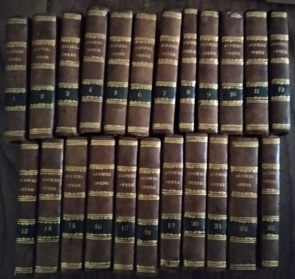 23 volumi in 24° (cm.12,5x8,5), legatura coeva in mz. pelle, tasselli colorati, titt. e fregi in oro ai dorsi, pp. 6100 ca. complessive. Al primo vol. ritratto dell’autore inc. in rame su tav. f.t. Sporadiche fioriture, qualche macchia di ossidazione ed ordinari segni d’uso del tempo ma complessivamente buon es. Raccolta completa dell’edizione pubblicata dal Majno in 22 volumi, così suddivisi: "Vita di Vittorio Alfieri scritta da esso" (2 voll.) - "Teatro tragico originale" (6 voll.) - "Teatro tragico ridotto" - "Teatro comico originale" (2 voll.) - "Teatro comico ridotto" (3 voll.) - "Poesie originali" (2 voll.) - "Poesie tradotte (2 voll.) - "Prose originali" (2 voll.) - "Prose tradotte" (2 voll.) - "Commentarj sulle tragedie" (1 vol.). I primi 9 volumi recano al frontespizio come luogo di stampa “Italia”, dal decimo vol. al ventiduesimo compare l’indicazione dell’editore Majno di Piacenza. Segue come 23° volume, con legatura uniforme ai precedenti volumi, l’edizione contraffatta del Misogallo, pubblicata a Firenze nel 1799 col falso luogo di stampa “Londra” (manca l’antiporta). Cfr. Parenti, Dizionario dei luoghi di stampa, 1951, pagg. 126-127.