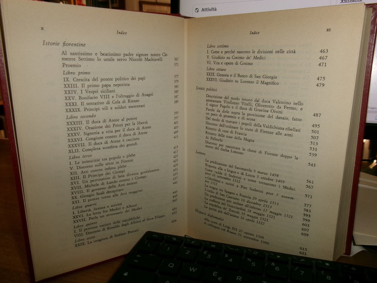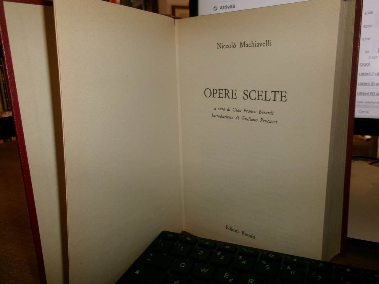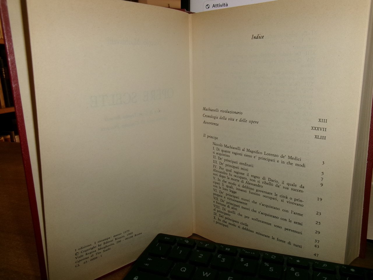 di Niccolò Machiavelli. Roma, Editori Riuniti, 1973. OPERE SCELTE. A cura di Gian Franco Berardi. Introduzione di Giuliano Procacci. In-8°, similpelle bordeaux con titoli in oro. xliv, 805 pp. Libro usato ma ben conservato. Uff. stanzetta a sinistra I - 2