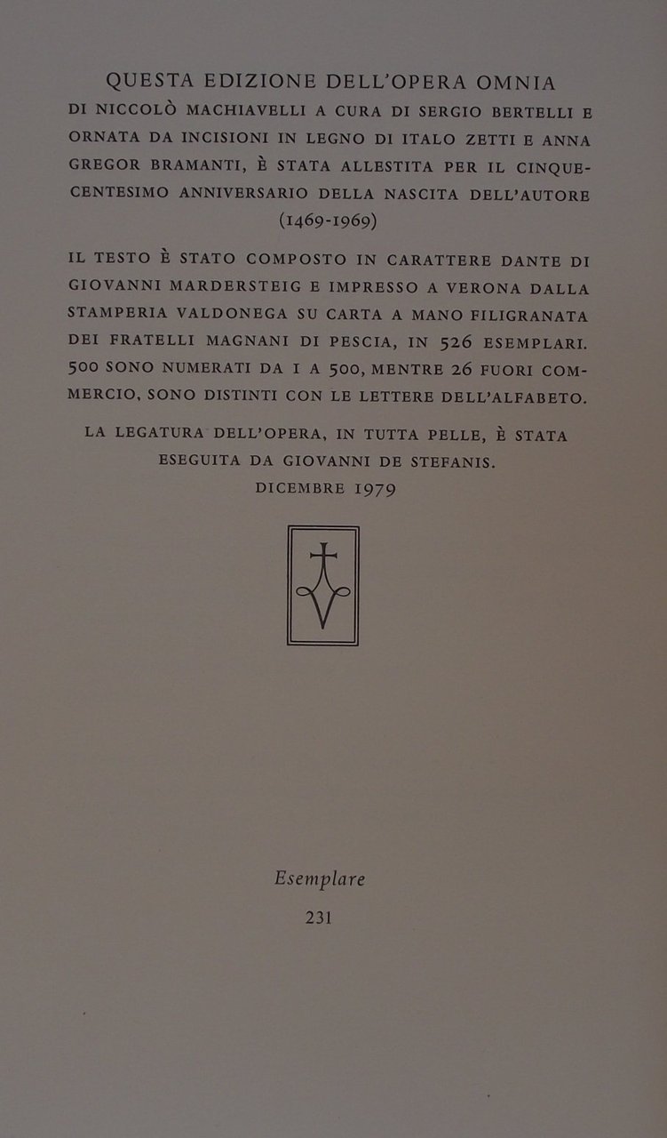 Undici volumi di cm. 29, pp. 5.000 ca. complessive. Con xilografie nel testo di Italo Zetti. Splendida legatura di lusso in pieno marocchino granata-violetto a grana larga, dorsi a nervi con titoli e filetti in oro, piatti inquadrati da triplice filetto, ripetuto all'interno. Tagli di testa dorati ed entro singole custodie in cart. rigido con bordini in pelle. Rilegatura di Giovanni De Stefanis. Ottimo stato di conservazione. Superba edizione, ideata per il cinquecentenario della nascita di Machiavelli (1469); composta in carattere Dante. Se ne stamparono, nell'arco di 14 anni, 500 esemplari su carta a mano filigranata Magnani. Il testo è curato da Sergio Bertelli. Il volume X contiene una dettagliata bibliografia critica delle edizioni di Machiavelli mentre l'ultimo comprende un'appendice e gli esaustivi indici. Tra le più importanti produzioni della stamperia Valdonega.