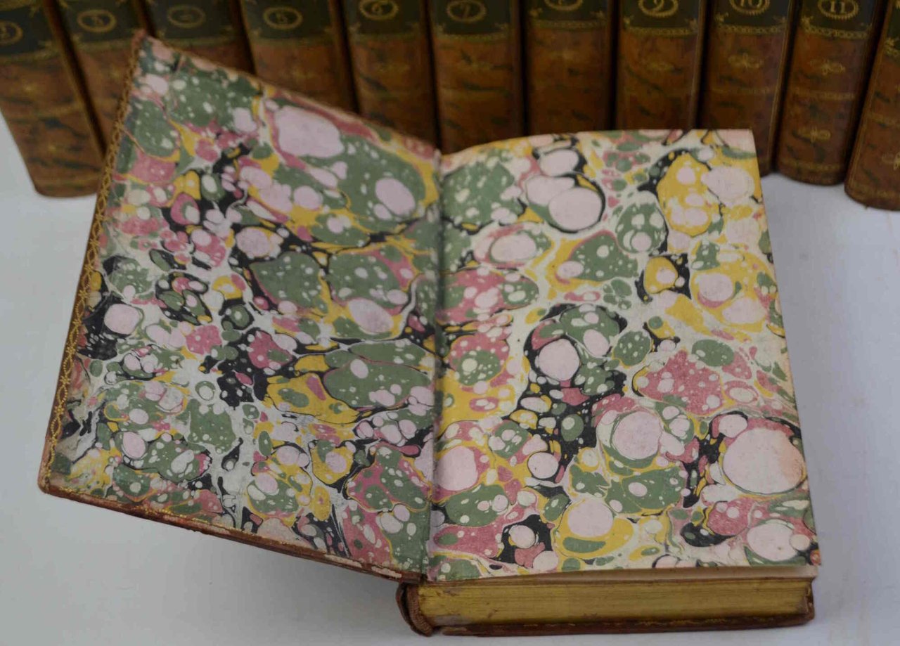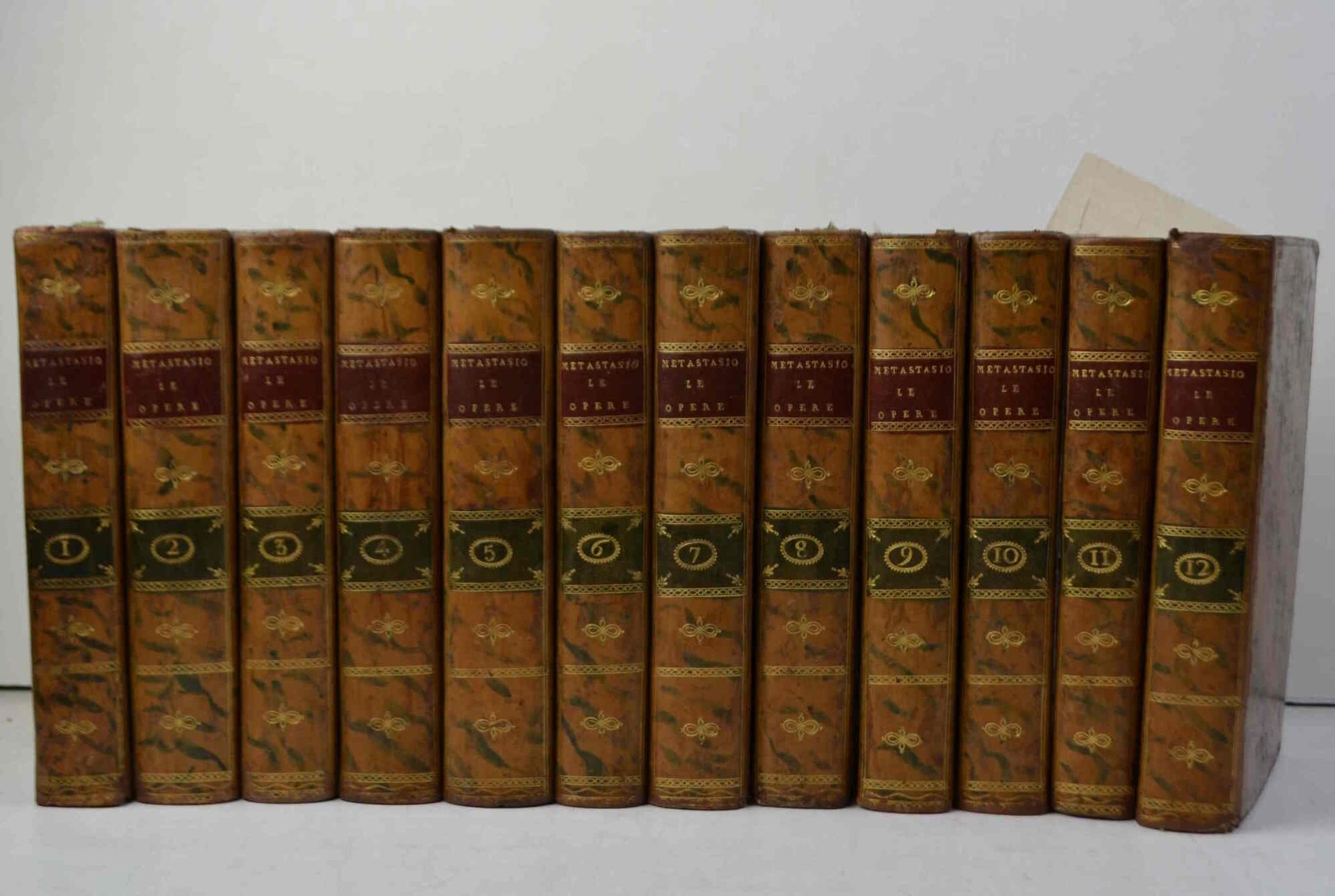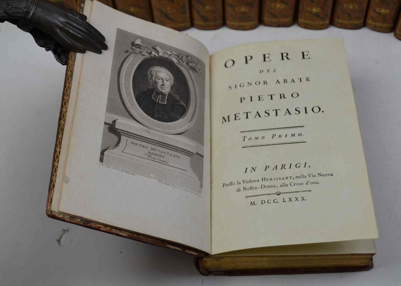 Dodici volumi di cm. 22, pp. 5.000 circa complessive. Ritratto dell’autore all’antiporta del primo volume e 37 tavole incise in rame fuori testo. Bella e solida legatura coeva in piena pelle, dorsi lisci con fregi in oro e titoli su doppio tassello in marocchino rosso. Piatti inquadrati da cornice in oro. Sguardie marmorizzate e tagli dorati. Esemplare stampato su carta vergata con alcune parti su carta tendente al verde. Esemplare genuino ed in ottimo stato di conservazione. Celebre figurato settecentesco impreziosito dalle belle figure di Cipriani, Cochin, Martini e Moreau ed incise da Bartolozzi, Carmona e altri. Gamba: “Tra le infinite edizioni dei Drammi del Metastasio questa è nobilissima... ed ebbe l’approvazione dell’immortale poeta.”. Cfr. anche Cohen 706-7.
