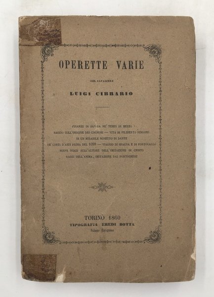 OPERETTE varie del cavaliere Luigi Cibrario. FINANZE di SAVOIA ne' tempi di mezzo. Saggio sull'Origine dei COGNOMI. Vita di Filiberto PINGONE. Di un mirabile SONETTO di DANTE. De Conti di ASTI prima del 1098. Nota sul COMMERCIO degli SCHIAVI a GENOVA nel secolo XIV. Viaggio di SPAGNA e PORTOGALLO del 1849. Nuovi indizi storici relativamente all.AUTORE dell'IMITAZIONE di CRISTO [Giovanni GERSO*. Raggi dell'anima - Imitazione dal Portoghese.