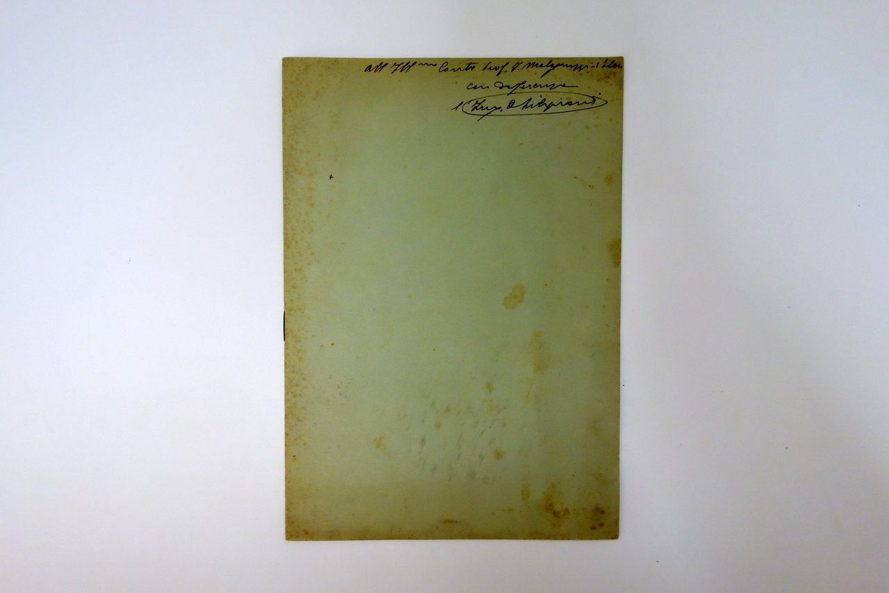 Senza dati tip., s. d. ma primo '900; cm 24x16,5; pp. 4 non num., con due ill. fotogr. e un disegno in b/n dell'autore. Brossura cartacea d'epoca, con dedica autografa dell'autore al margine superiore.