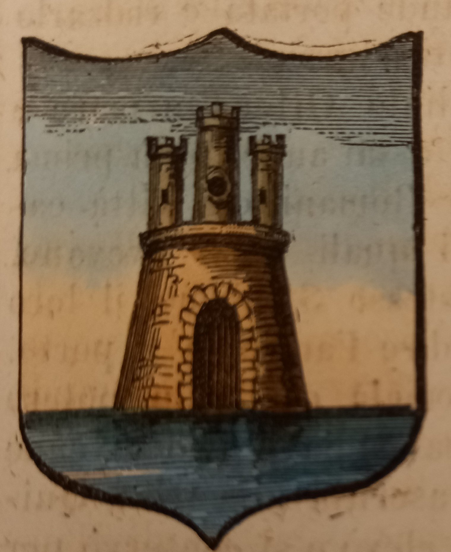 Piccolo stemma comunale colorato a mano d’epoca (cm. 3,8 x 3,2 ca.). Stralcio dal Dizionario Corografico illustrato dell’Italia, edito a Milano nel 1868. Ogni stemma di questa raccolta è inserito in una o più pagine di testo con la descrizione della località, notizie storico - geografiche e statistiche (numero degli abitanti e degli elettori, guarnigioni della Guardia Nazionale, ecc.). Spesso il testo è redatto da studiosi locali o dai sindaci, con maggiori, interessanti notizie.
