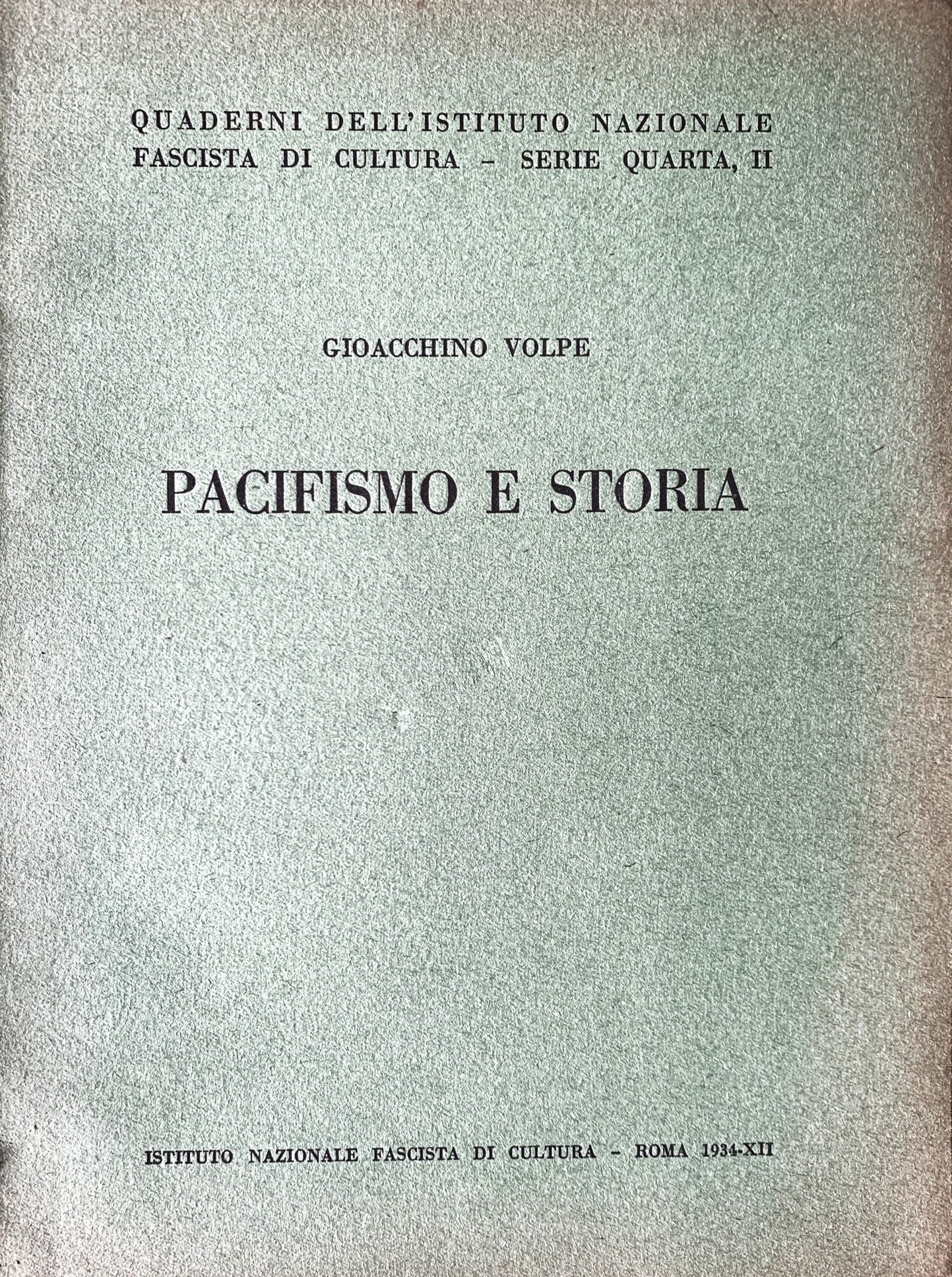 I ed.: 1934-XII. Quaderni dell'Istituto Nazionale Fascista di Cultura, Serie Quarta, II. VIII/ 44/ brossura con risvolti in cartoncino ruvido verde oliva con titoli in nero. Stato buono (lieve usura della copertina ai margini - scoloritura della copertina ai margini e al dorso - pagine lievemente ingiallite). Indice: Una macchinosa propaganda - Guerra, pace e civiltà - La revisione pacifista dei testi - Le "Risoluzioni Casares".