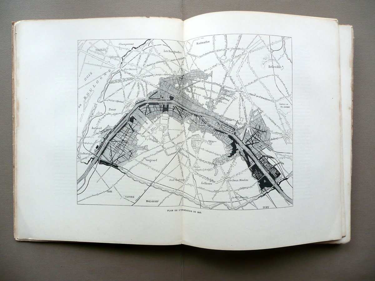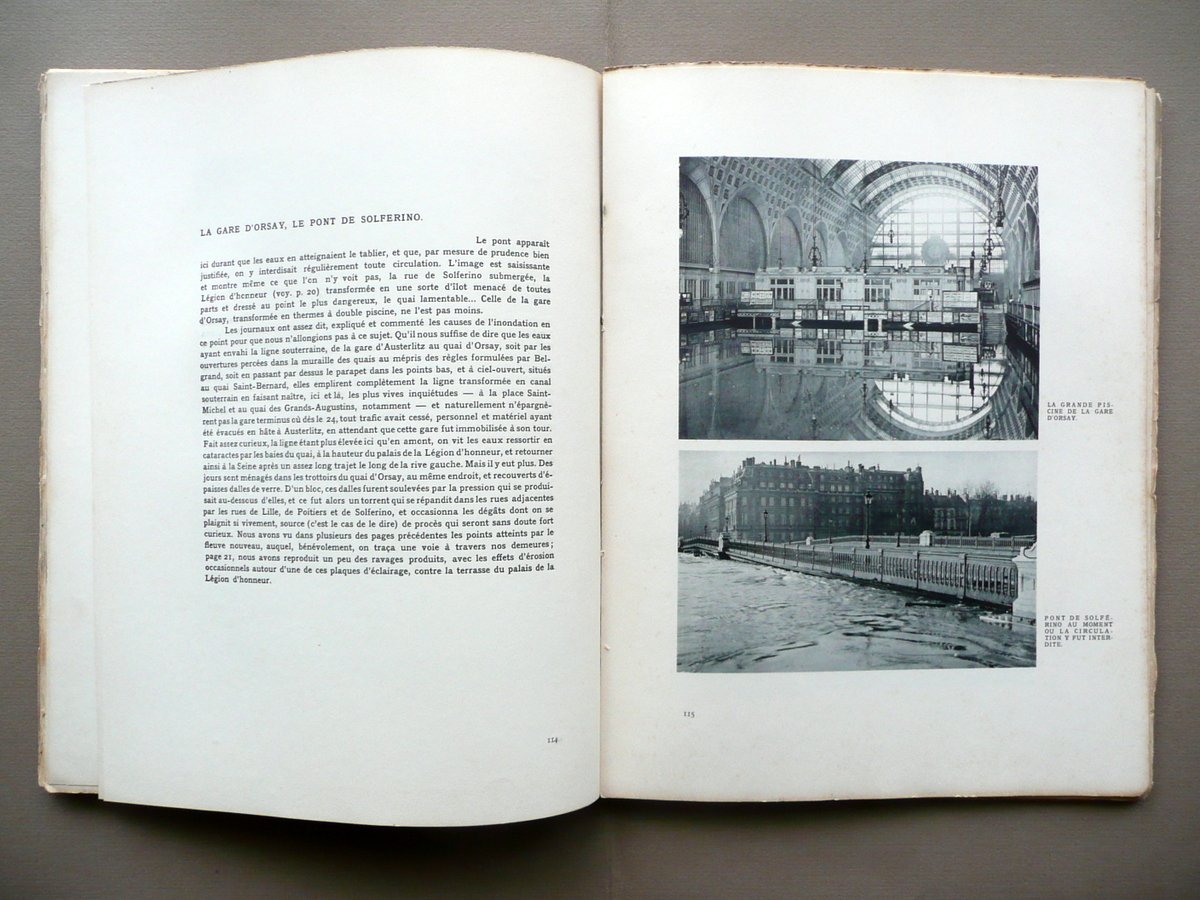Paris Inondé La crue de janvier 1910 Introduction historique et notes sur la récente inondation 207 planches et figures en phototypie Edition du Journal des Débats - Ch. Eggimann Editeur, Paris 1910, cm 33x25, pp. 174 con 207 tavole e ill. quasi tutte fotografiche in b/n nel t. e fuori t.; brossura ed. ill. a colori. Testo in francese. Condizioni di conservazione Esemplare complessivamente ben conservato con tracce d'uso; brossure con alcune minime bruniture e leggere tracce di sporco; margini e angoli con qualche minimo strappetto, alcune lievi abrasioni e gore di vecchia umidità che interessano in misura leggera e circoscritta anche il margine est. di qualche pagina, senza mai coinvolgere il testo o le illustrazioni (vedi foto); dorso con qualche strappetto e una piccola fessurazione alla parte sup.; cuffia inf. con un paio di piccole mancanze. Interni buoni con minime bruniture. Interessante e dettagliata pubblicazione di grande formato, dedicata alla grande alluvione di Parigi del 1910. Ricchissimo l'apparato iconografico, quasi interamente costituito da illustrazioni fotografiche d'epoca. Interessante anche la carta su due pagine della città, con in evidenza le aree maggiormente colpite dall'esondazione della Senna e dal collasso del sistema fognario cittadino. Testo in francese. SETT115.L10948 N