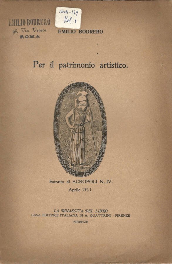 Fascicolo spillato, copertina semi rigida, segno adesivo identificativo al piatto esterno, dissolvenza diffusa e tracce d'uso da impronte e, polvere, in complessivo, interno ed esterno, buono stato di conservazione. Estratto di Acropoli N. IV., Aprile 1911. Numero Pagine 19