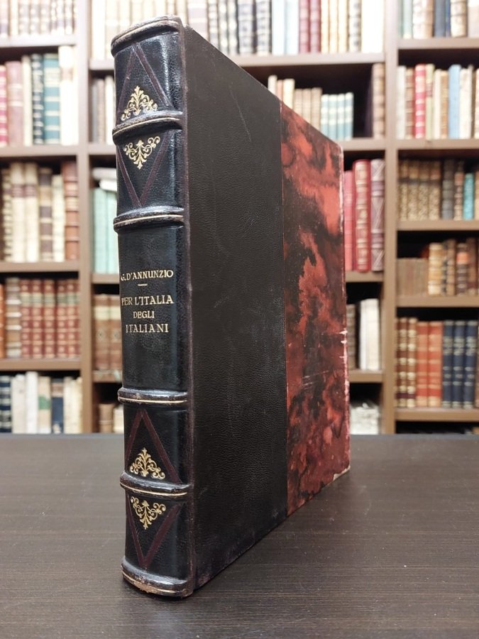 <span style="font-style: normal;">In-8° (cm. 23,7), elegante legatura d'amatore in mezza pelle nera (leggere abrasioni ai bordi), dorso con titolo e filetti ai nervi in oro, fregi in oro e </span><i>boredaux</i><span style="font-style: normal;">, piatti e risguardi marmorizzati; conservata la brossura originale a stampa con stemma silografico in rosso e titolo in nero (piccola integrazione ad un angolo); pp. XII [4] 427 [1] in barbe, in ottimo stato (lievissime e sporadiche fioriture). </span>Prima edizione nella tiratura comune impressa su carta verghettata bianca. «Discorso pronunziato a Milano dalla ringhiera del Palazzo Marino la notte del 3 agosto 1922, con aggiunti il comento inedito, il messaggio del convalescente agli uomini di pena, tre preghiere dinanzi agli altari disfatti e sette documenti d'amore». Cfr. Guabello 320; De Medici 114. Esemplare molto buono. (NX)