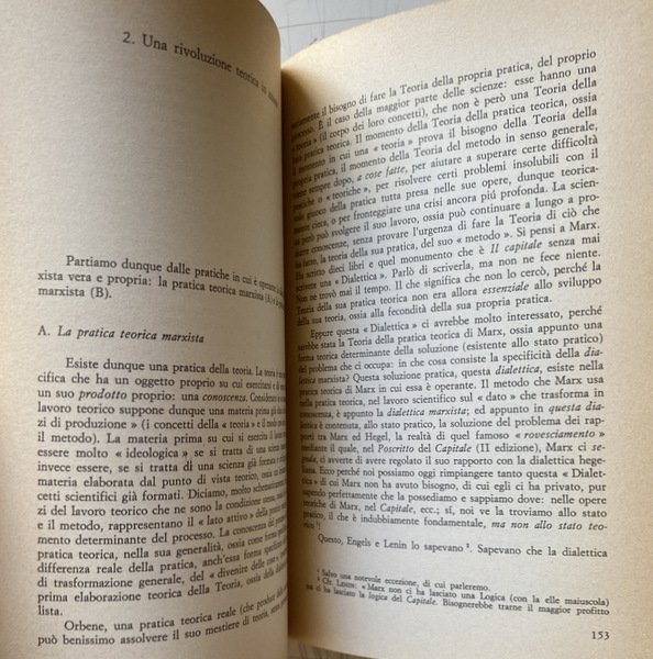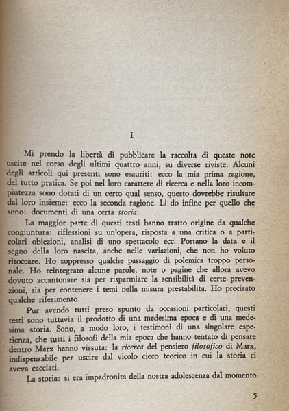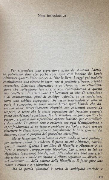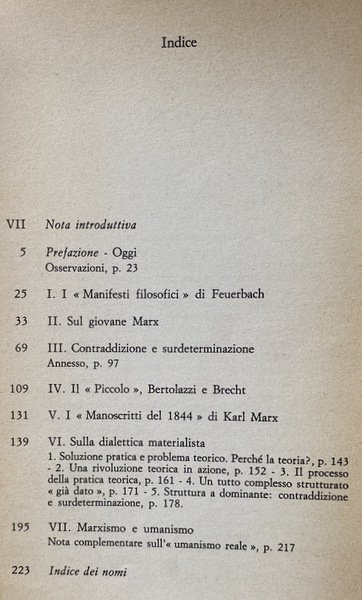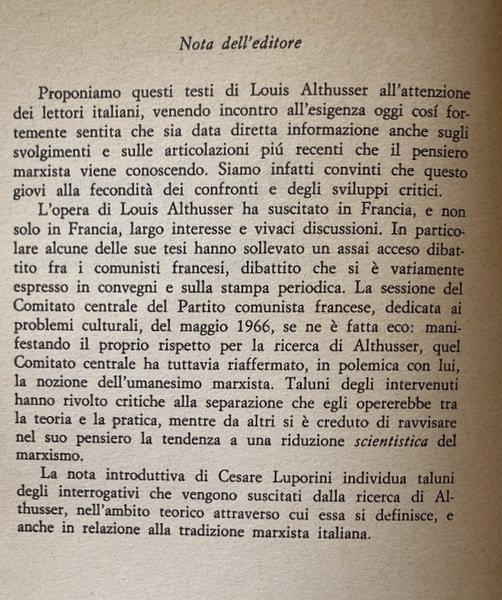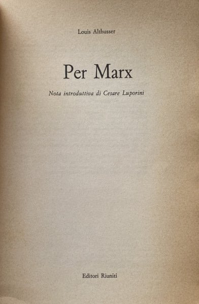 Soggetti: Filosofia, Marxismo strutturalista, Karl Marx, Materialismo storico, Dialettica marxista, Storia contemporanea, Capitalismo, Economia politica, Opere generali, Saggi critici, Letture critiche, Teorie filosofiche, Classici, Comunismo, Proletariato, Borghesia, Lotta di classe, Russia, Germania, Inghilterra, Francia, Unione Sovietica, Internazionale, Anni Sessanta, Novecento, Fonti, Bibliografia, Riferimento, Consultazione, Collezionismo, Althusseriana, Concetti, Interpretazione, Sistemi marxisti, Surdeterminazione, Surplus, Classi sociali, Lavoro, Schiavitù, Sfruttamento, Rivoluzione, élite, Ceti dominanti, Claude Lévi-Strauss, Jacques Lacan, Michel Foucault, Hegel, Classe operaia, Teoria della pratica teorica, Contraddizioni, Strutturalismo, Leggere Il Capitale, Scienza marxista, Ristrutturazione, Revisionismo, Critica letteraria, Ermeneutica, Scuole di pensiero, Correnti, Cultural studies, György Lukács, Limiti, Socialismo scientifico, Ideologia, Lenin, Für Marx, Giovane Marx, Manifesto, Feuerbach, Coscienza, Stato, Struttura, Problemi, Metodo, Rapporti di Produzione, Merce, Umanesimo, Natura, Determinazione, Scritti politici, Raccolte, Articoli, François Maspero, Dibattiti, Cina, Mao-Tse Tung, Idealismo, Ideologia tedesca, Diseguaglianza, Imperialismo, Formazione, Contraddizione, Surdeterminazione, Sovradeterminazione, Teatro materialista, Il Piccolo, Bertolazzi, Brecht, Letture umanistiche, Esistenza, Alienazione, Società, Miti, Condizioni, Lavoro, Totalità, Manifesti filosofici, 1844, Manoscritti, Umanismo reale, Rifiuto, Morte, Bergson, Bachelard, Antonio Gramsci, Cornu, Hobbes, Hoeppner, Kant, Kautsky, Labriola, Lapin, Jean-Jacques Rousseau, Plekhanov, Ricardo, Saint-Simone, Sartre, Locke, Bogdanov, Adam Smith, Palmiro Togliatti, PCUS, Stalin, Strehler, Théâtre matérialiste, Scientismo, Cultura, Arretratezza, Sciopero, Sindacati, Guerra, Europa, Concentrazione, Monopolio, Industria, Imperialismo, Partito comunista francese, Influenze culturali, Tradizione, Ortodossia, Libri Vintage Fuori catalogo, Federico Guglielmo IV, Friedrich Engels, Diritto, Eclettismo, Complessità, Plusvalore, Questione ebraica, Scritti giovanili, Philosophy, Structuralist Marxism, Historical Materialism, Marxist Dialectic, Contemporary History, Capitalism, Political Economy, General Works, Critical Essays, Critical Readings, Philosophical Theories, Classics, Communism, Proletariat, Bourgeoisie, Class Struggle, Germany, England, France, Union Soviet, International, Sixties, Twentieth century, Sources, Bibliography, Reference, Consultation, Collectibles, Concepts, Interpretation, Marxist systems, Youth writings, Social classes, Labor, Slavery, Exploitation, Revolution, Ruling classes, Working class, Theory of Theoretical practice, Contradictions, Structuralism, Reading Capital, Marxist Science, Restructuring, Revisionism, Literary criticism, Hermeneutics, Schools of thought, Currents, Limits, Scientific socialism, Ideology, Young Marx, Consciousness, State, Structure, Problems, Method, Relations of Production, Commodities, Humanism, Nature, Determination, Political Writings, Collections, Articles, Debates, China, Idealism, German ideology, Inequality, Imperialism, Formation, Contradiction, Overdetermination, Materialist theater, Humanistic readings, Existence, Alienation, Society, Myths, Conditions, Work, Totality, Philosophical Posters, Manuscripts, Real humanism, Rejection, Death, Scientism, Culture, Backwardness, Strike, Unions, War, Europe, Concentration, Monopoly, Industry, Imperialism, French Communist Party, Cultural influences, Tradition, Orthodoxy, Out of print books, Frederick William IV, Law, Eclecticism, Complexity, Surplus value, Jewish question