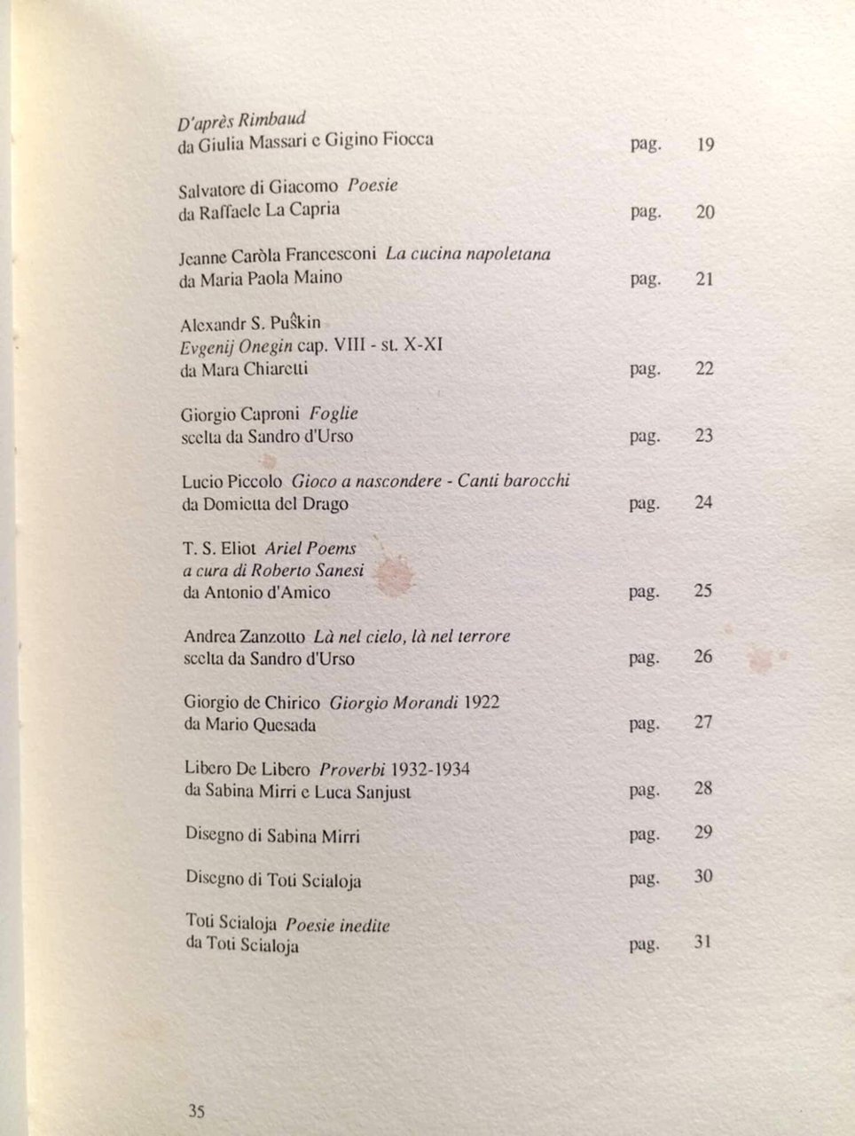 Edizione di 100 copie numerate, la nostra è la n. 88. Volume edito a cura di Luciano Trina in occasione dell'ottantesimo compleanno di Sandro d'Urso - Brossura editoriale muta con sovraccoperta a stampa, 35 pagine stampate su carta Alcantara-Sicars, in barbe. Disegni su tavole fuori testo di Isabella Ducrot, Giosetta Fioroni, Sabina Mirri e Toti Scialoja. Elenco dei contributori e indice consultabile nelle nostre immagini. Lievi segni del tempo, nel complesso esemplare ottimamente conservato di una rarissima edizione da e per gli amici, sinora forse mai circolata sul mercato librario.