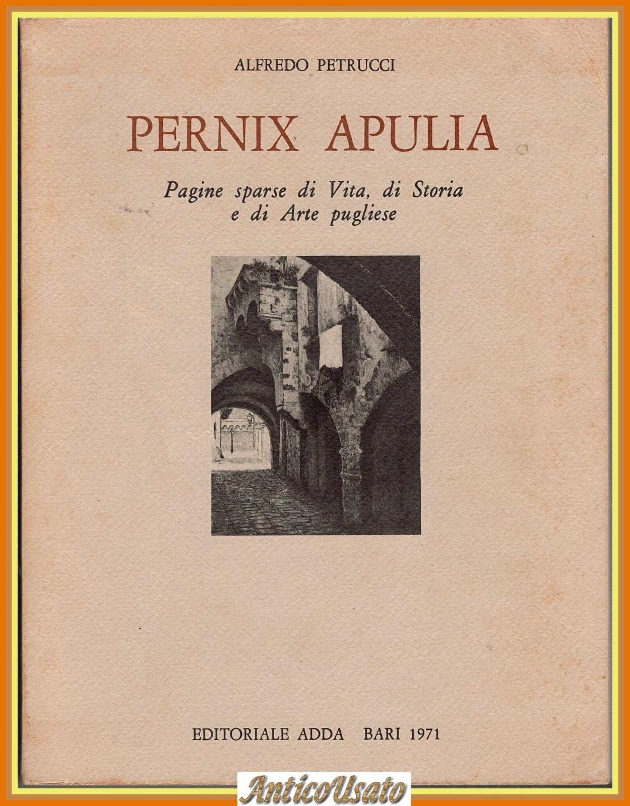 PERNIX APULIA Pagine sparse di Vita, di Storia e di Arte pugliese di Alfredo Petrucci. Presentazione di Pasquale Soccia. Editoriale Adda, Bari, 1971. 318 pagine. Numerose illustrazioni in bianco e nero nel testo. Copertina editoriale in brossura. Stato di conservazione: molto buono (pagine normalmente ingiallite).