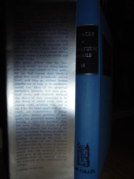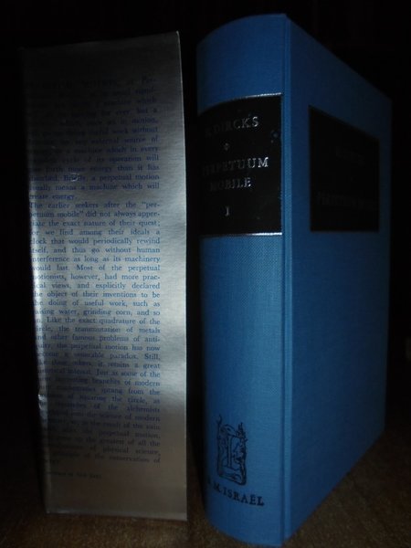 By Henry, DIRKS. Amsterdam, B.M. Israel, 1968. PERPETUUM MOBILE; or, a history of the search for self-motive power, from the 13th the 19th century. In-16°, tela edit. con titoli sui piani e nei dorsi con sovracopertine. xli, 558 pp.; xxxi, 368 pp. con numerose illustrazioni in bianco e nero nel testo. Esemplare come nuovo. Neg. mens. bianca.