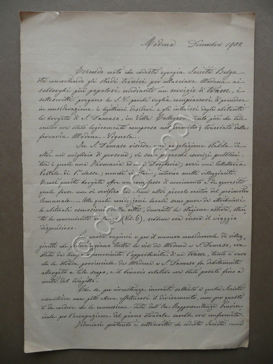 Petizione, Petizione manoscritta diretta alla Società Belga per la linea del tram Modena - San Damaso firmata dal Prof. Giuseppe Cesari Petizione interamente manoscritta su carta, datata Modena, dicembre 1902, testo disposto ad entrambe le facciate, firma dell'Autore (il Prof. Giuseppe Cesari) al termine del testo. Cm 31x21. Condizioni di conservazione Esemplare in buone condizioni con tracce d'uso, leggera piega centrale di conservazione, margini e angoli con alcune lievi tracce e accenni di pieghette, margine sup. con un paio di piccoli strappetti. Interessante e motivata petizione firmata dall'Autore (il Prof. Giuseppe Cesari) e diretta alla società belga incaricata degli studi tecnici e della costruzione della linea tranviaria. Presenza di un'attenta e dettagliata descrizione della borgata: [.] In San Damaso risiede una popolazione stabile di oltre un migliaio di persone; vi sono parecchi esercizi pubblici, tra i quali una Farmacia ed una Drogheria; una Collettoria Postale di 1° classe; nonché vi stanno intorno molti villegganti [.]" SC03.D9278 N "
