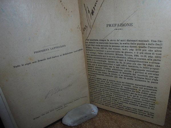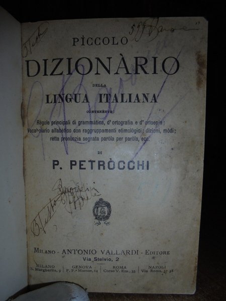 P. Petròcchi. Milano, Antonio Vallardi Editore, (s.d. 1913?). Piccolo dizionario della lingua italiana. In-16° piccolo, tela edit. xxxii, 740 pp. ex libris applicato al verso della copertina anteriore. Lo stato di conservazione è buono con alcune firme nel frontespizio e poche note marginali. Neg. pacco 4 Valla carc.