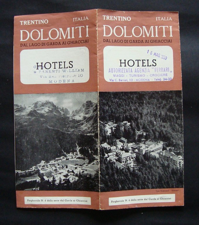 Pieghevole n 6 serie dal Garda ai Ghiacciai Dolomiti Hotels 1950 Trentino